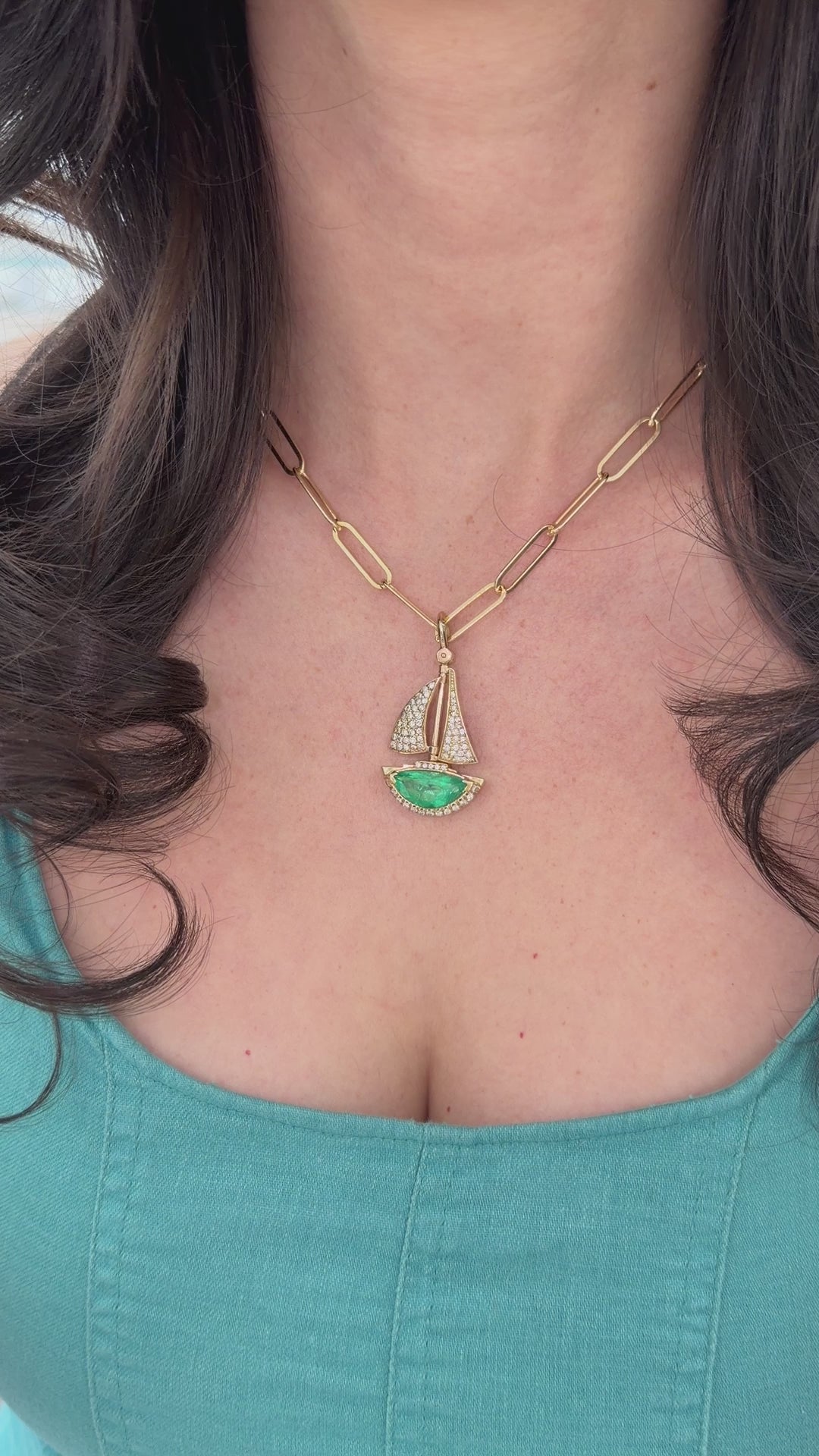 Displayed is an exquisite, unisex, completely handmade, and exclusive sailboat Colombian emerald necklace. This masterpiece was expertly handmade to perfection in substantial solid yellow gold. A diamond-encrusted mainsail and jib were dexterously designed to move freely as it shifts on the mast of the sailboat, making this piece come to life. The hull encompasses a stunning crescent shape Colombian emerald faceted/cut specifically for this pendant. The ethically mined Muzo emerald weighs an impressive AAA 5.23cts and has beautiful eye clarity and a soothing medium vivid green color. The Colombian emerald features high-quality characteristics and substantial statement size. Pave set diamonds are also found on the keel and topside. A large bail will allow average to largely-sized chains to easily slide through.