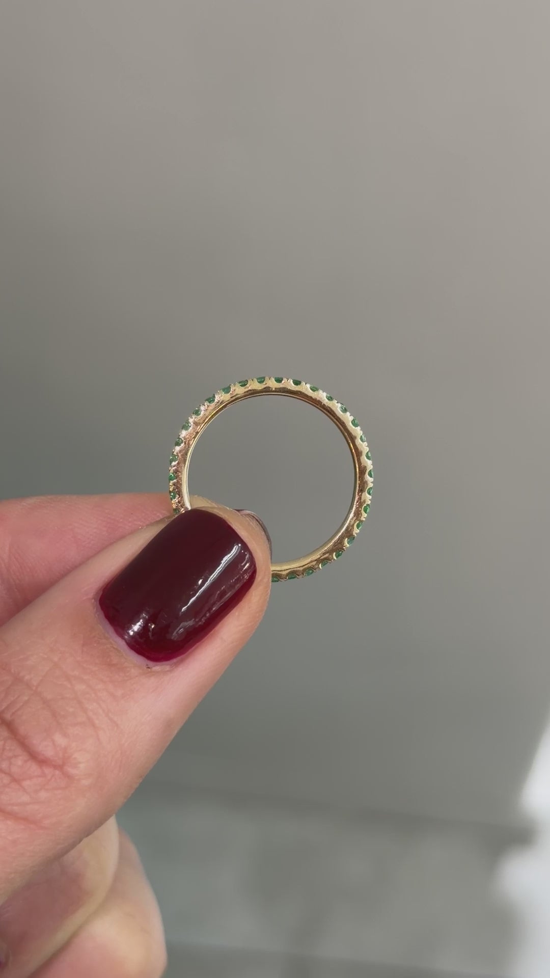 Notes: This eternity band features natural emeralds set fully around the band. Emeralds are a beautiful yet delicate gemstone, and due to the full eternity design the stones remain exposed around the entire ring. To preserve the emeralds and their settings, this piece should be worn with care and removed during activities that may involve impact or pressure.