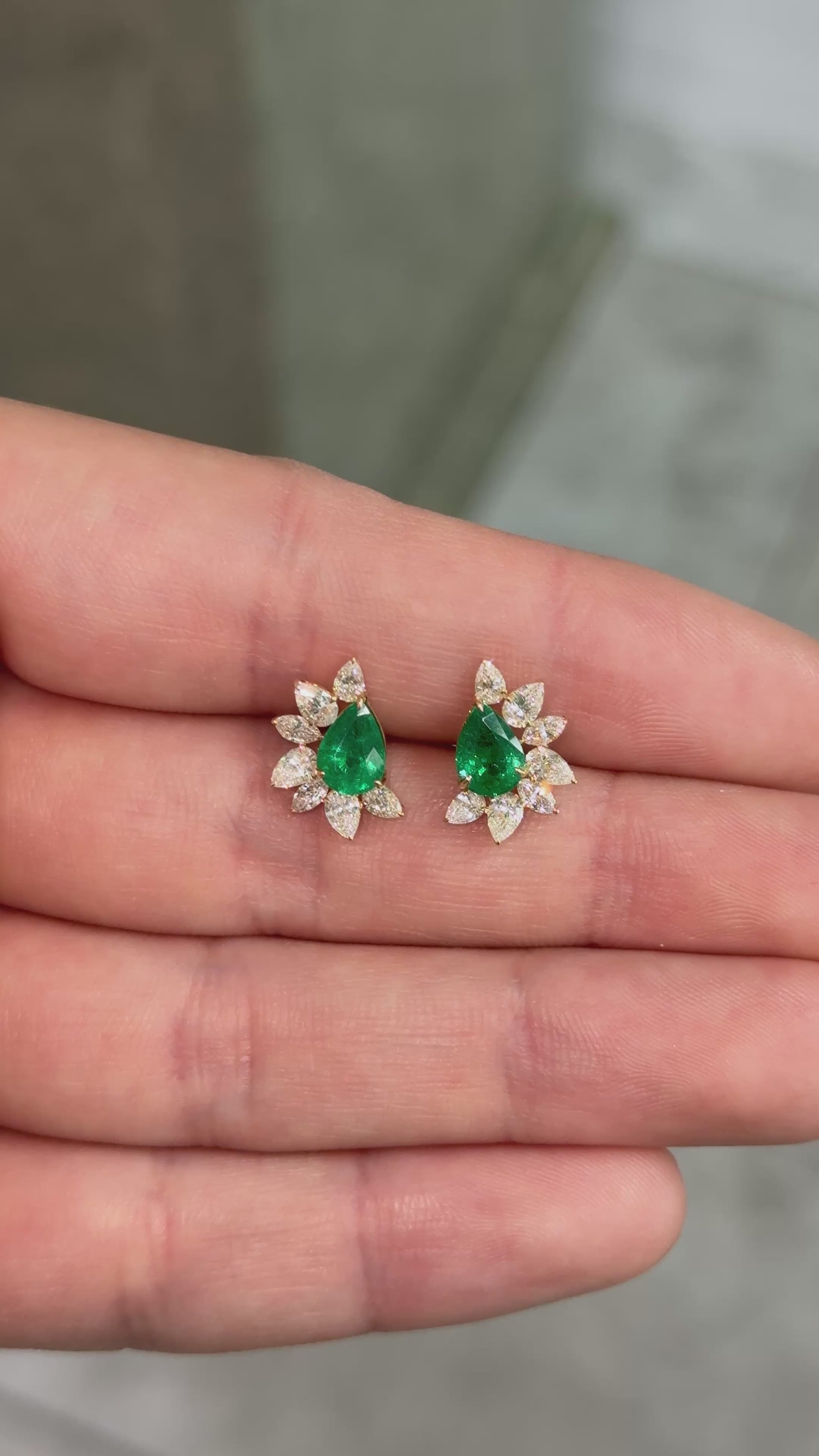 2.68tcw 18K Natural Rich Green Pear Emerald & Pear Diamond Starburst Stud Earrings- Yellow Gold