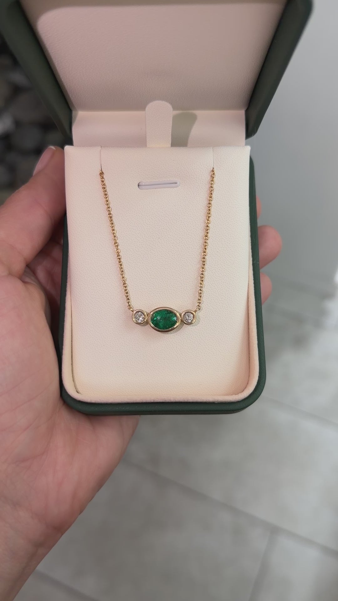 1.0tcw Everyday East-West Oval Emerald & Diamond Bezel Three Stone Necklace 14K