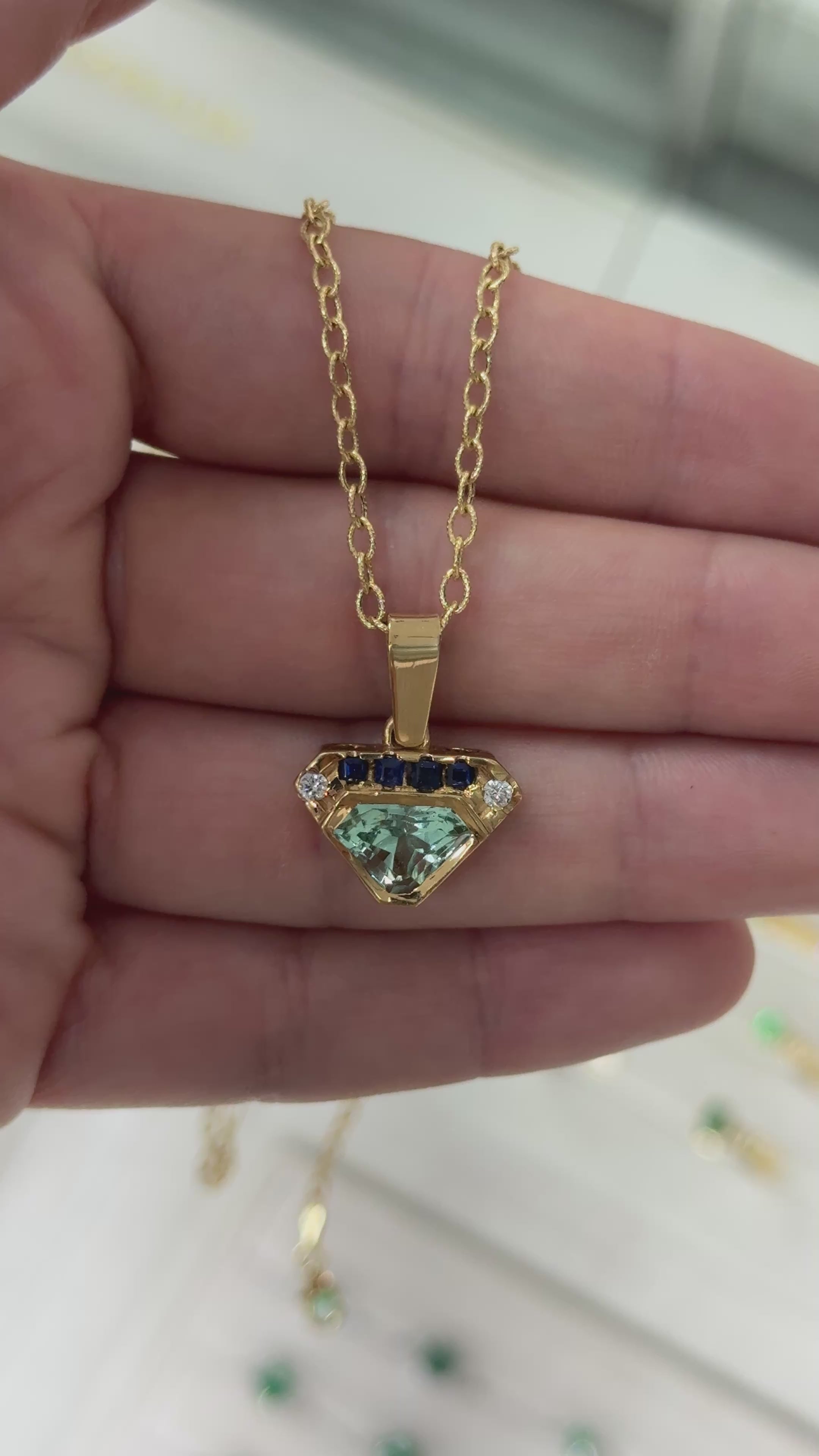 2.80tcw VVS Clarity Colombian Emerald Shield Cut Pendant Blue Sapphire & Diamonds
