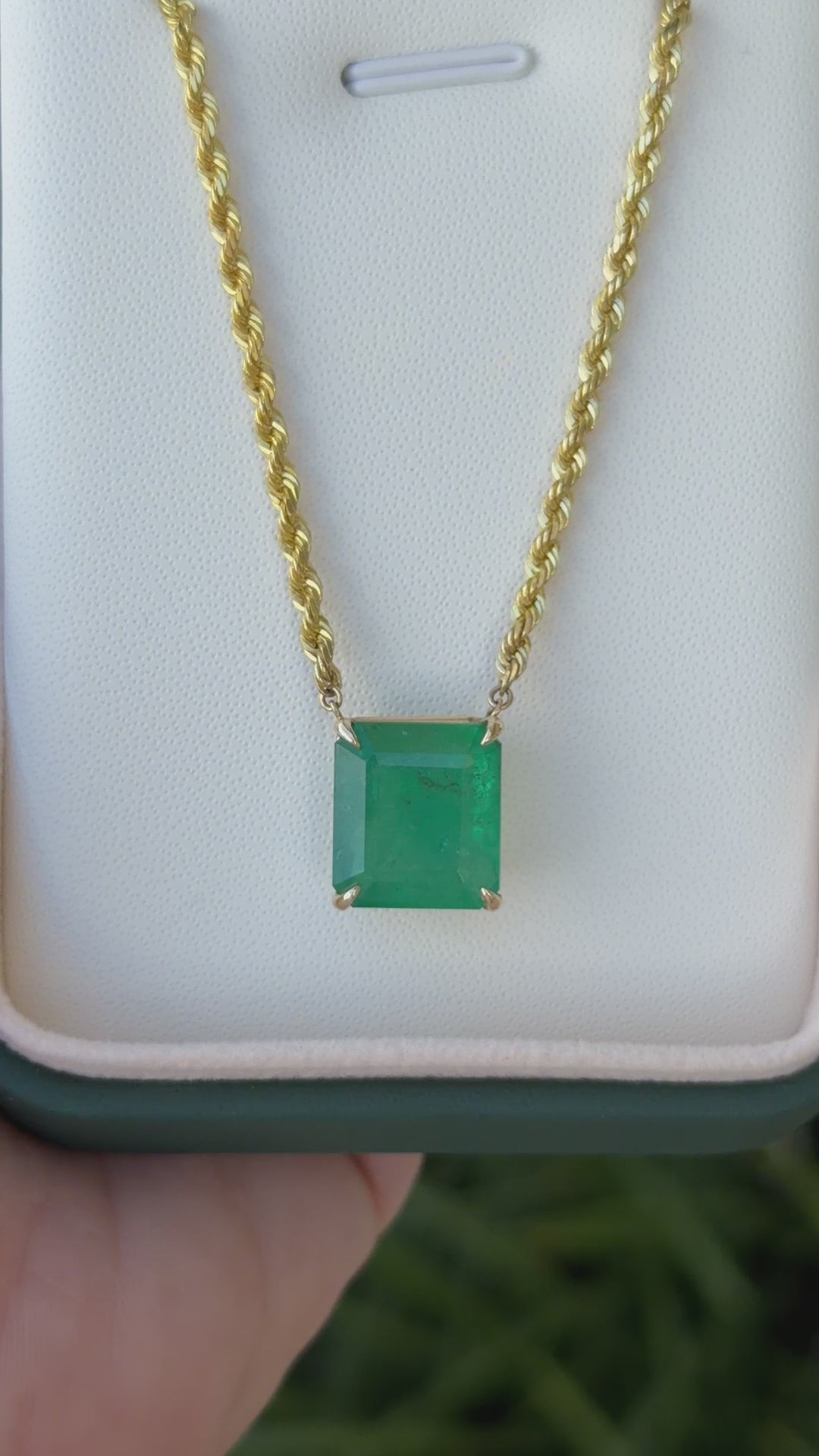 10.38ct 14K Emerald Cut Emerald Solitaire 20" Rope Chain Stationary Necklace