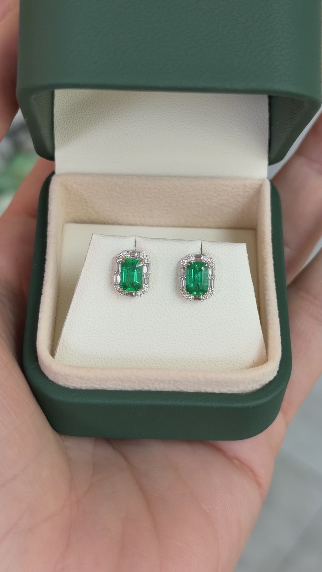 1.59tcw Fine Quality Natural Emerald & Baguette Diamond Halo Stud Earrings 18K Two Toned