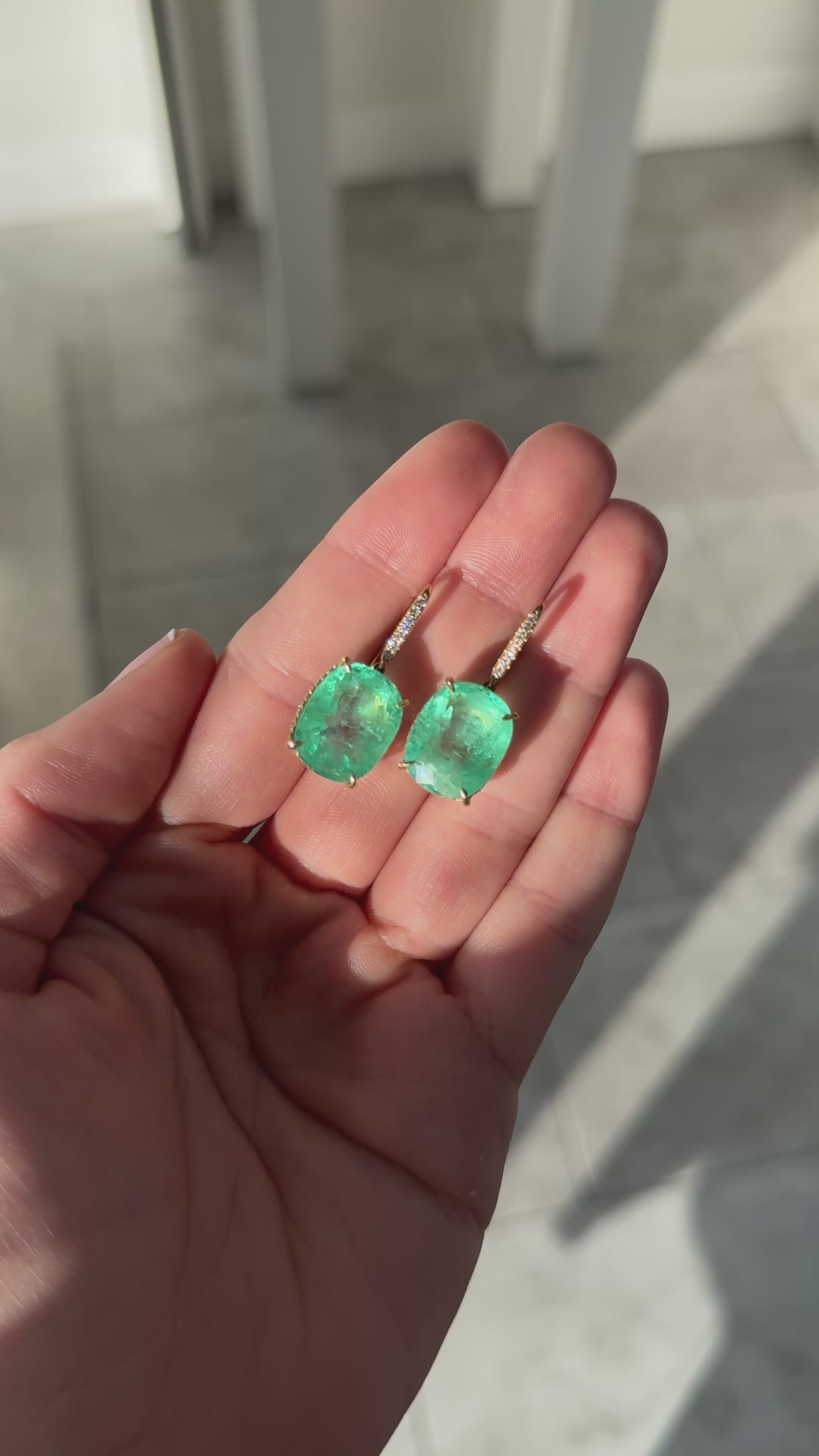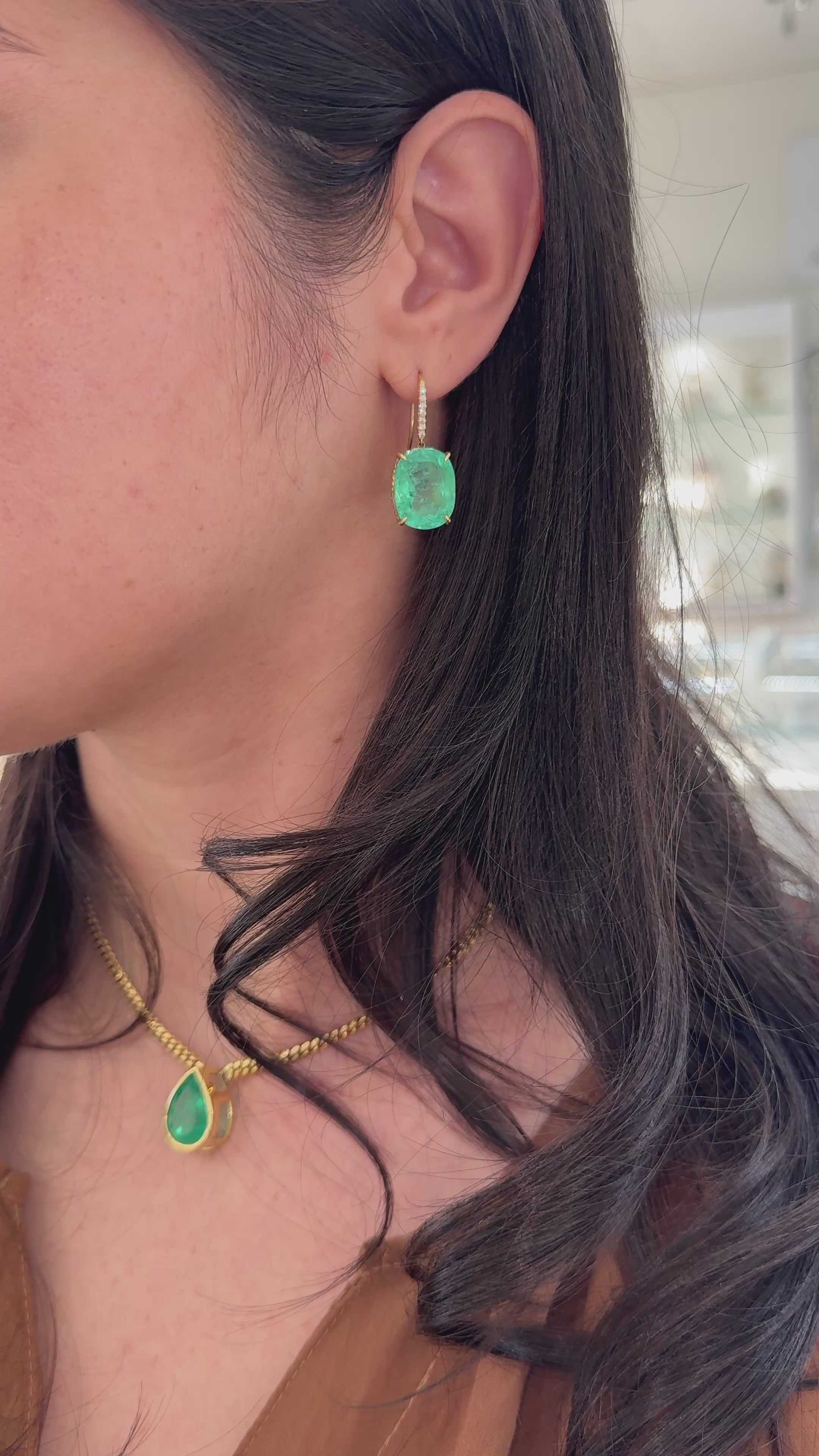 25.70tcw Large Cushion Cut Colombian Emerald & Diamond Dangle Earrings 18K