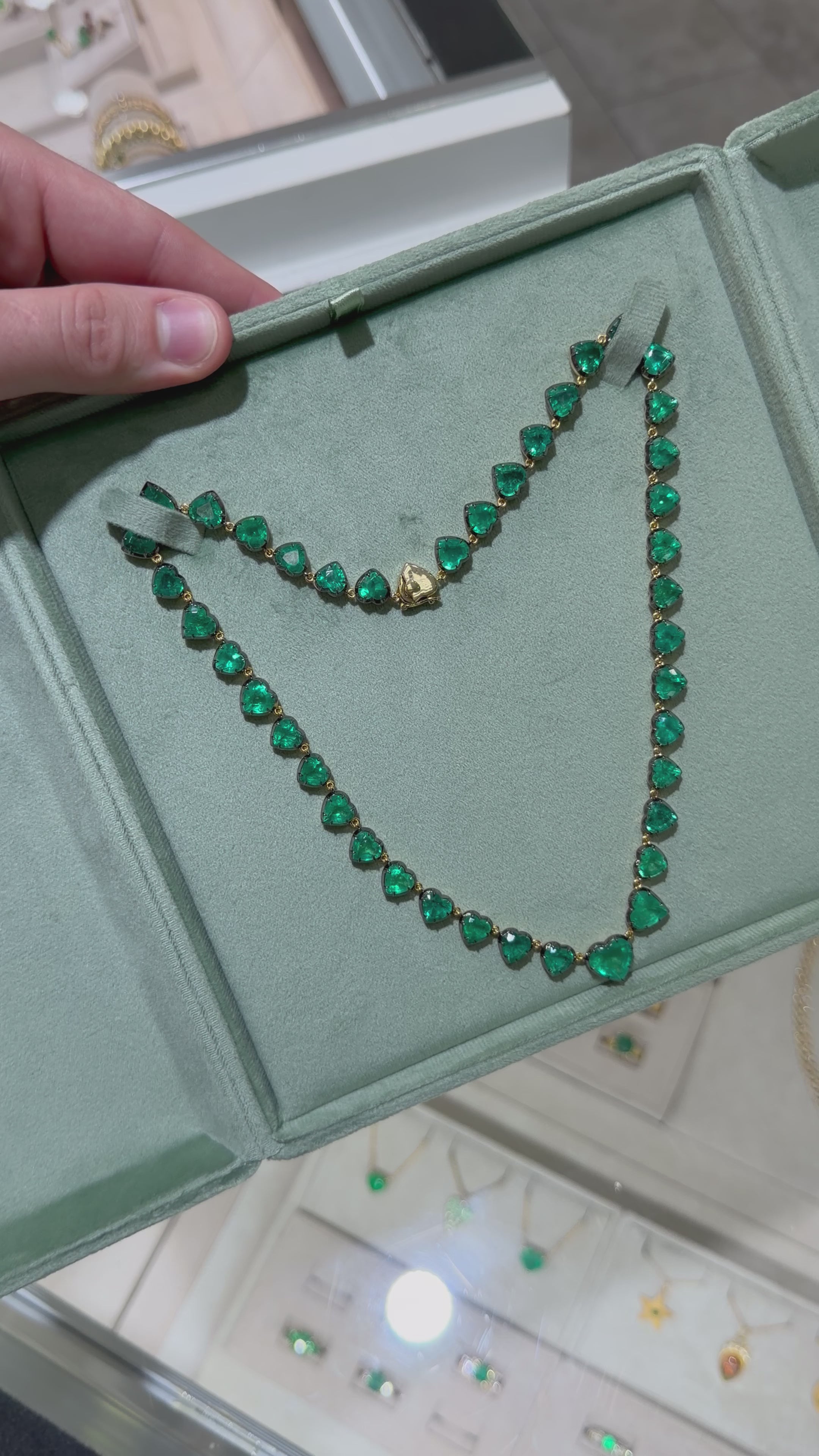 60.98tcw 14K Custom Cut Heart Emerald Tennis Necklace with Black Rhodium 18-inch