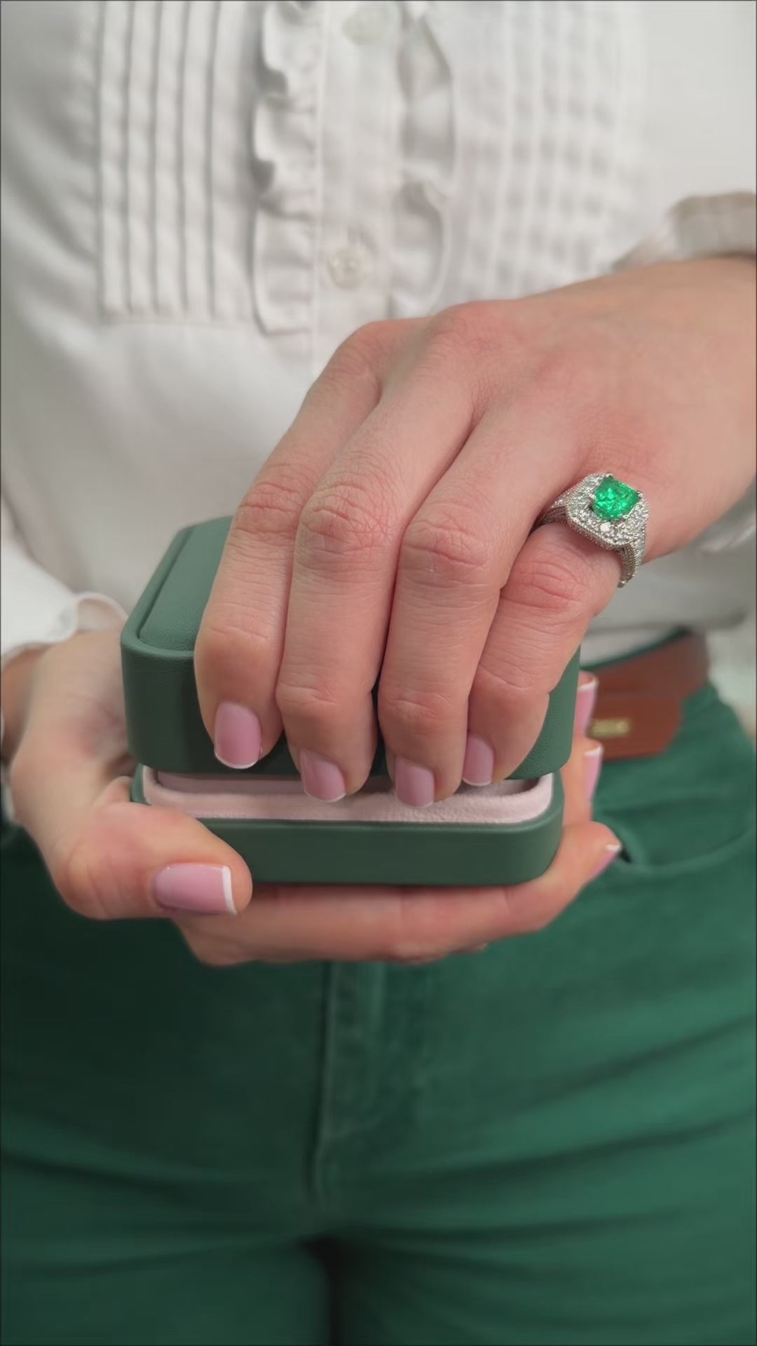 Surrounding the emeralds are 5.40 carats combined of round pavé set diamonds, expertly dispersed to create a luminous and commanding presence. An additional 1 carat of baguette diamonds introduces architectural structure and refined brilliance, completing the design with balance and sophistication. The diamonds are F G color, offering bright, icy fire that perfectly complements the vibrant emeralds.