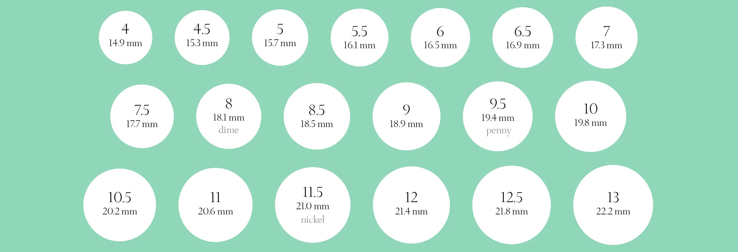 To find your ring size, use an existing ring that fits you well. Match the inside of that ring with one of the circles in our guide. When your ring has been placed on the right size you should only see the white circle with no green space inside your ring. If your ideal fit falls between two sizes, we recommend choosing the larger size.
