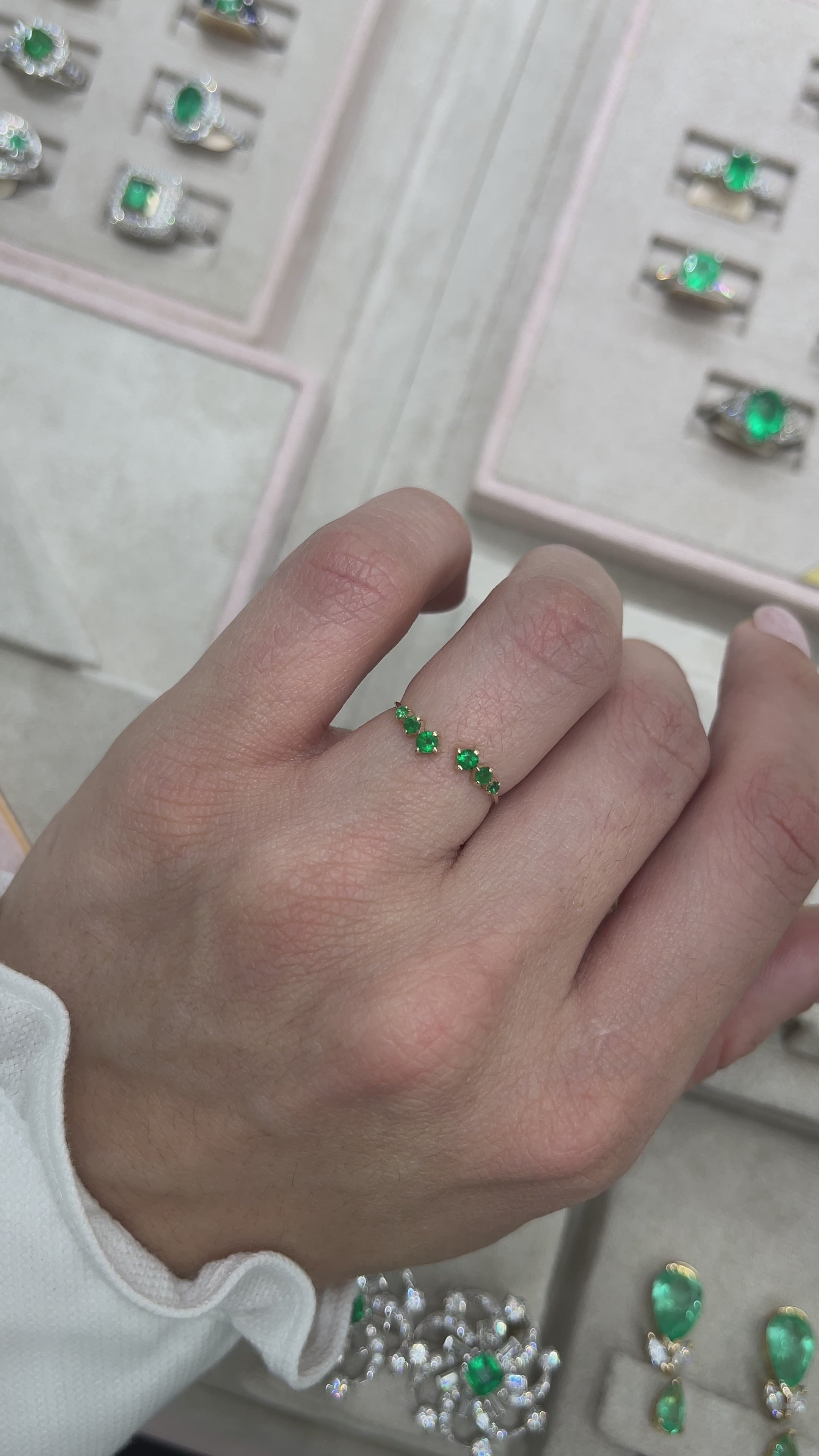 This delicate open-concept emerald ring is a vision of effortless beauty. Six perfectly matched emeralds, arranged in a graceful graduating design, adorn each side of the band, their luminous green hues radiating pure elegance. The emeralds are eye-clean and full of life, capturing light with every movement. Set on a dainty 14K gold band, this piece is designed for everyday wear, whether stacked with other favorites or worn alone as a subtle statement of timeless charm.