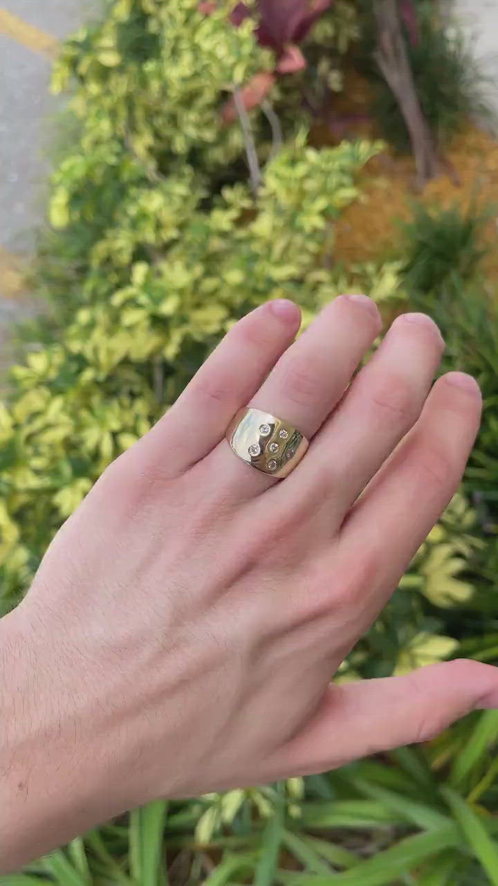 Displayed is a wide diamond statement band handcrafted in solid 14K yellow gold. Six brilliant-cut diamonds are bezel set across the center, beautifully framed by sleek polished gold for a refined and timeless look. With 0.50 total carats of sparkling diamonds, this ring offers luxurious presence and comfort, making it perfect for everyday elegance or as a distinctive statement piece.