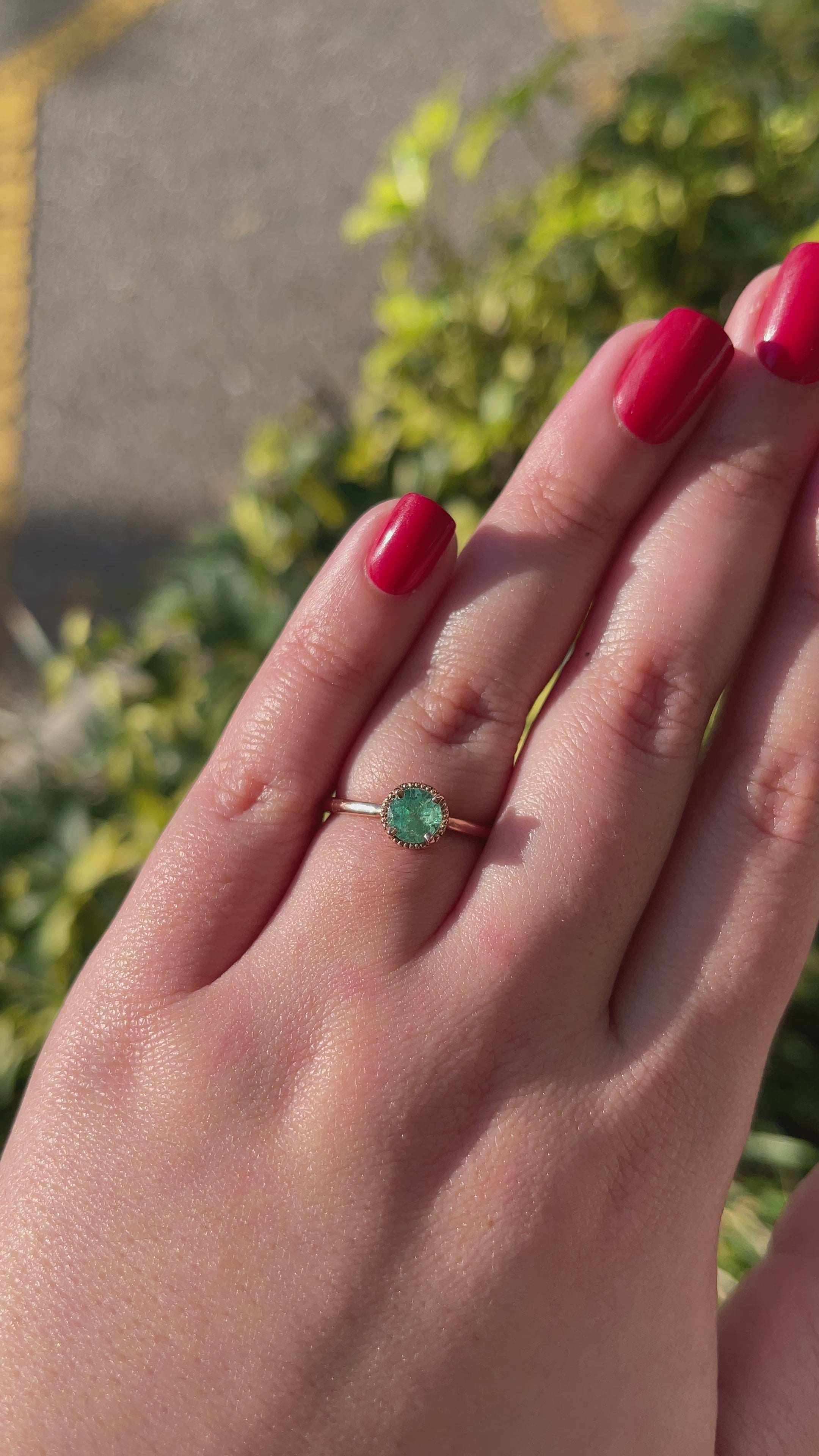 This stunning ring features a 0.90-carat natural round cut emerald, known for its timeless beauty and classic elegance. The emerald boasts a medium green color and very good luster, ensuring that it catches the eye with its brilliant sparkle. It is securely set in a four-prong setting crafted from 14k rose gold, which adds warmth and sophistication to the overall design. A beaded halo around the emerald adds intricate detail and further enhances the ring's visual appeal. This natural round-cut emerald ring is a true statement piece that will be treasured for years to come.