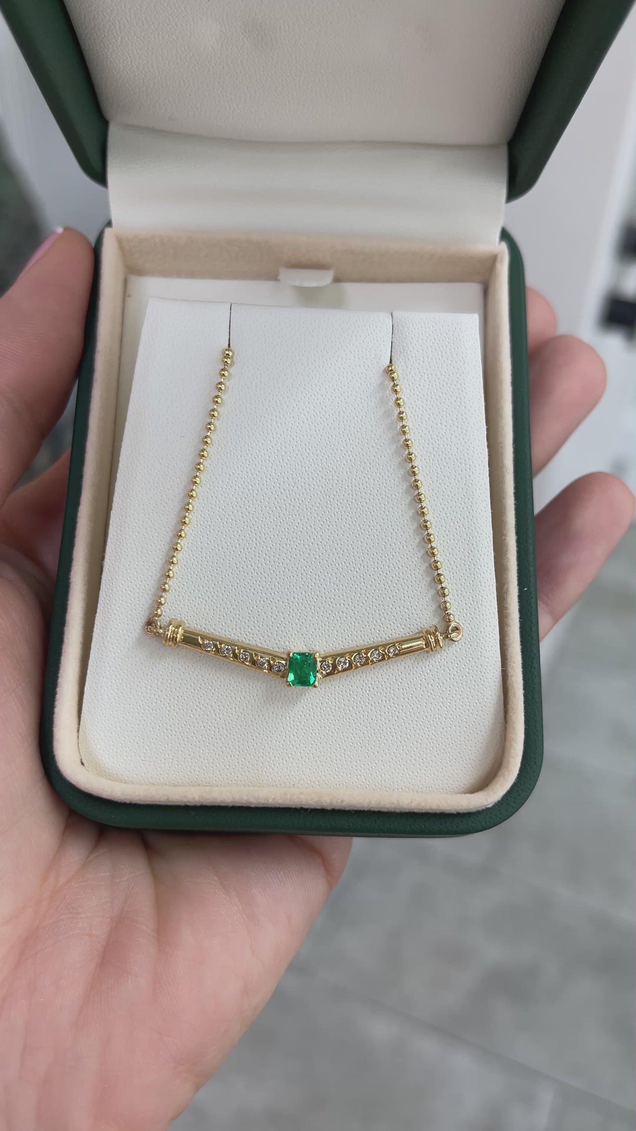 A spectacular Colombian emerald and diamond necklace. An exquisite, AAA+ dark green emerald cut is encased in the very center of this design and is embellished on either side with brilliant round diamonds. Ten, lustrous diamonds highlight the neck piece and shine under any light setting. The beaded 14K gold chain is attached and measures 20 inches long.