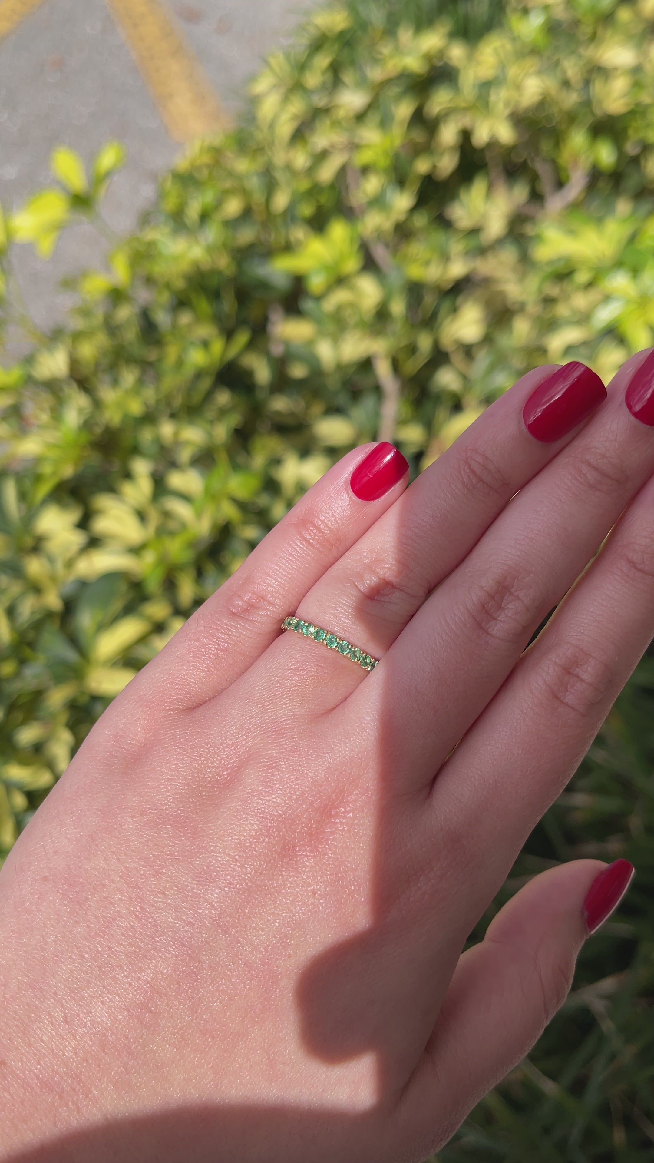 A stunning natural emerald band ring. This gorgeous piece features multiple, round-cut, Zambian emeralds, going halfway through the band. The gemstones feature a gorgeous, medium-dark spring green color and varying excellent-very good luster. French set for the prettiest mounting in a 14K gold setting. Perfect for everyday stacking!