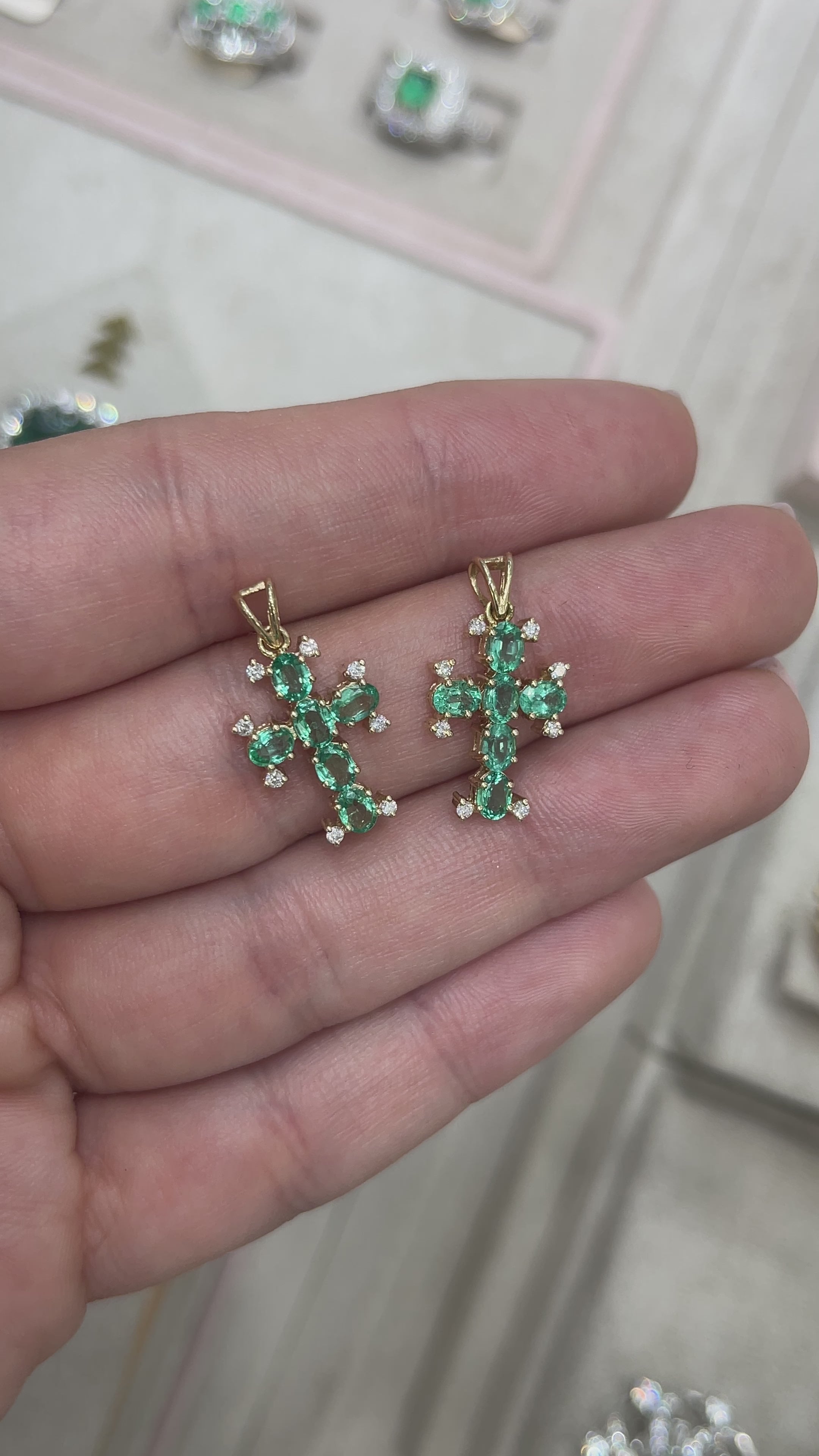 This exquisite emerald cross pendant is a true symbol of elegance and grace. Featuring vibrant oval emeralds that are beautifully eye-clean, each stone radiates a captivating medium-light green hue. Delicate round diamonds accentuate the edges, adding a touch of brilliance to the design. Crafted in 14K yellow gold, the pendant’s timeless beauty is enhanced by its refined proportions. The bale is designed to accommodate a small-sized chain, making it a meaningful and versatile piece to cherish. Measures 22.5mm x 12mm.