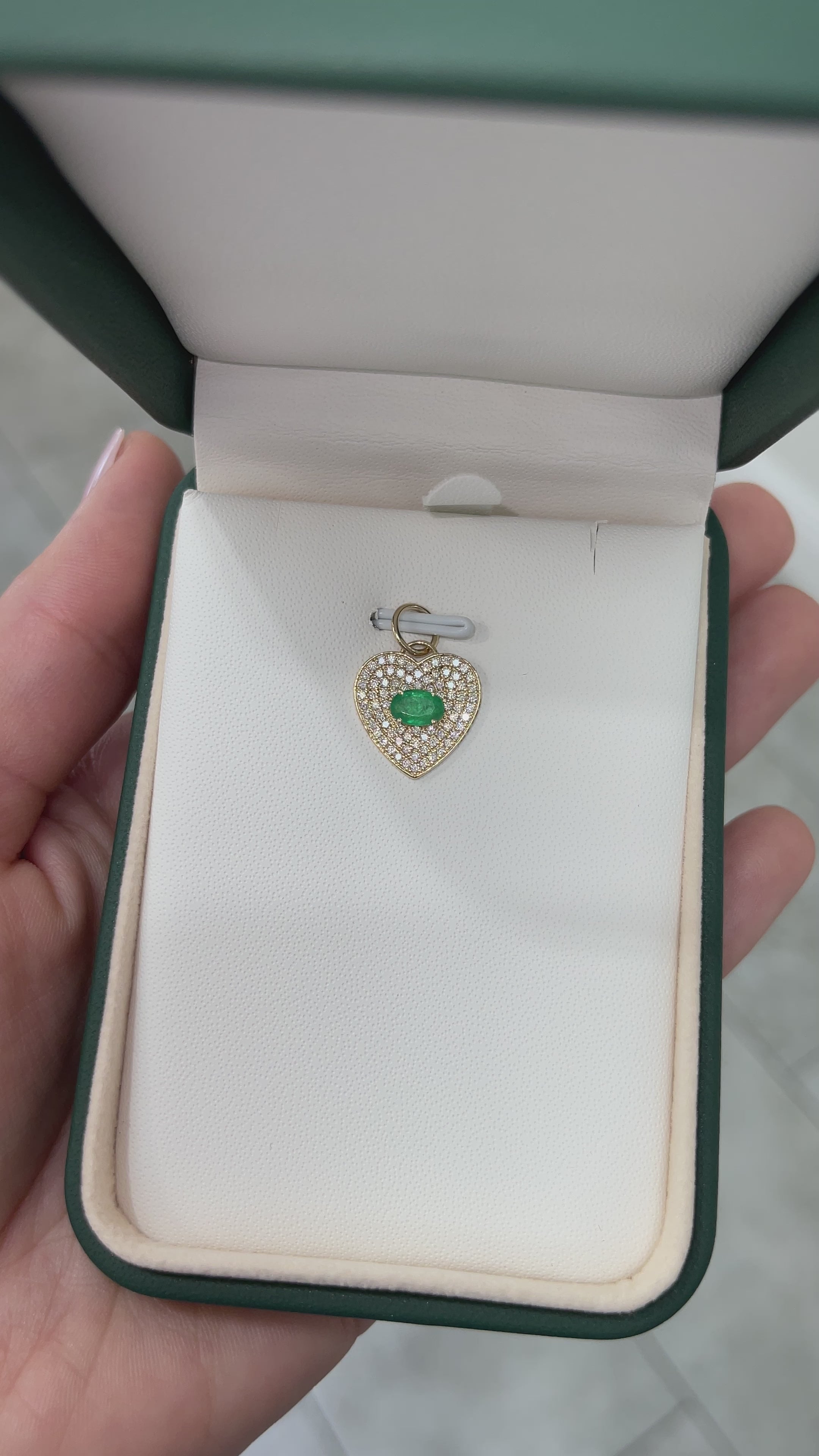 Adorn yourself with the captivating charm of our Emerald & Diamond Heart Pendant. At its center, an oval-cut emerald, set east to west in a four-prong setting, displays a medium green color and semi-transparent clarity. Encircled by a heart-shaped cluster of brilliant round diamonds and crafted in luxurious 14k gold, this pendant exudes elegance and romantic sophistication.
