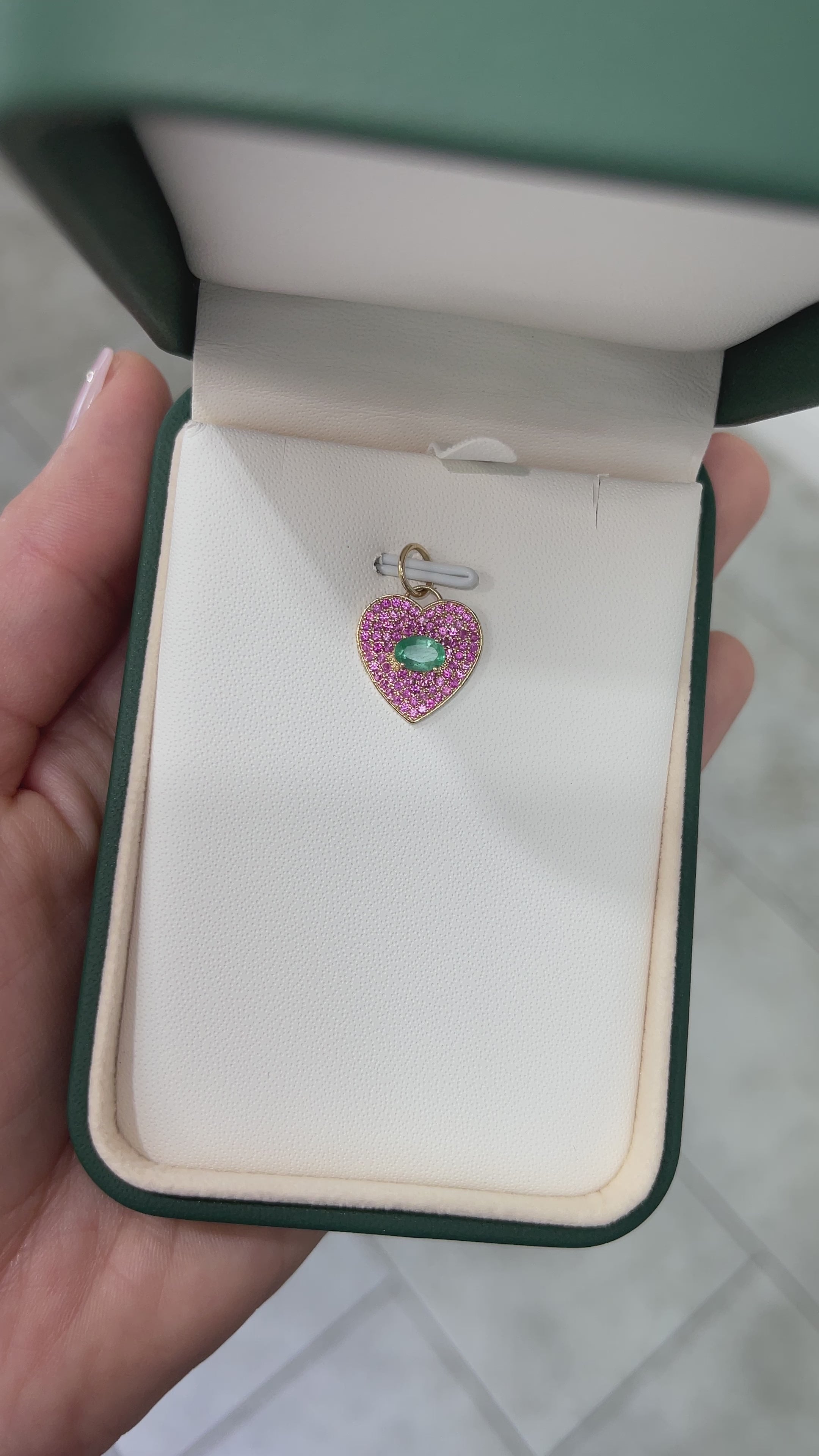 Adorn yourself with the captivating charm of our Emerald & Sapphire Heart Pendant. At its center, an oval-cut emerald, set east to west in a four-prong setting, displays a medium green color and semi-transparent clarity. Encircled by a heart-shaped cluster of pink sapphires and crafted in luxurious 14k gold, this pendant exudes elegance and romantic sophistication.