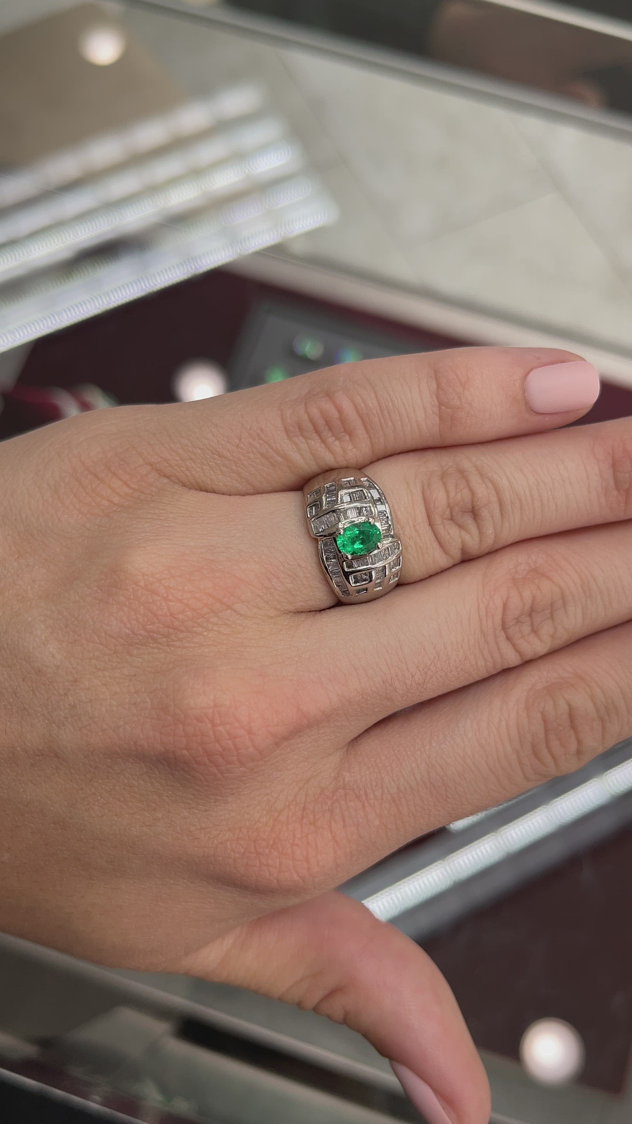 1.0tcw 18K Colombian Emerald-Oval Cut & Diamond Baguette Cocktail Ring