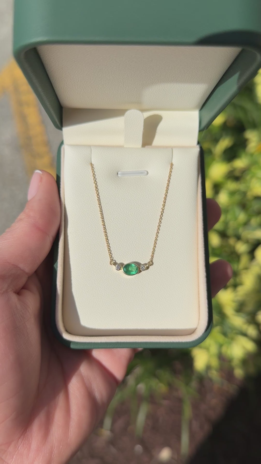 1.0tcw Everyday East-West Oval Emerald & Diamond Bezel Three Stone Necklace 14K
