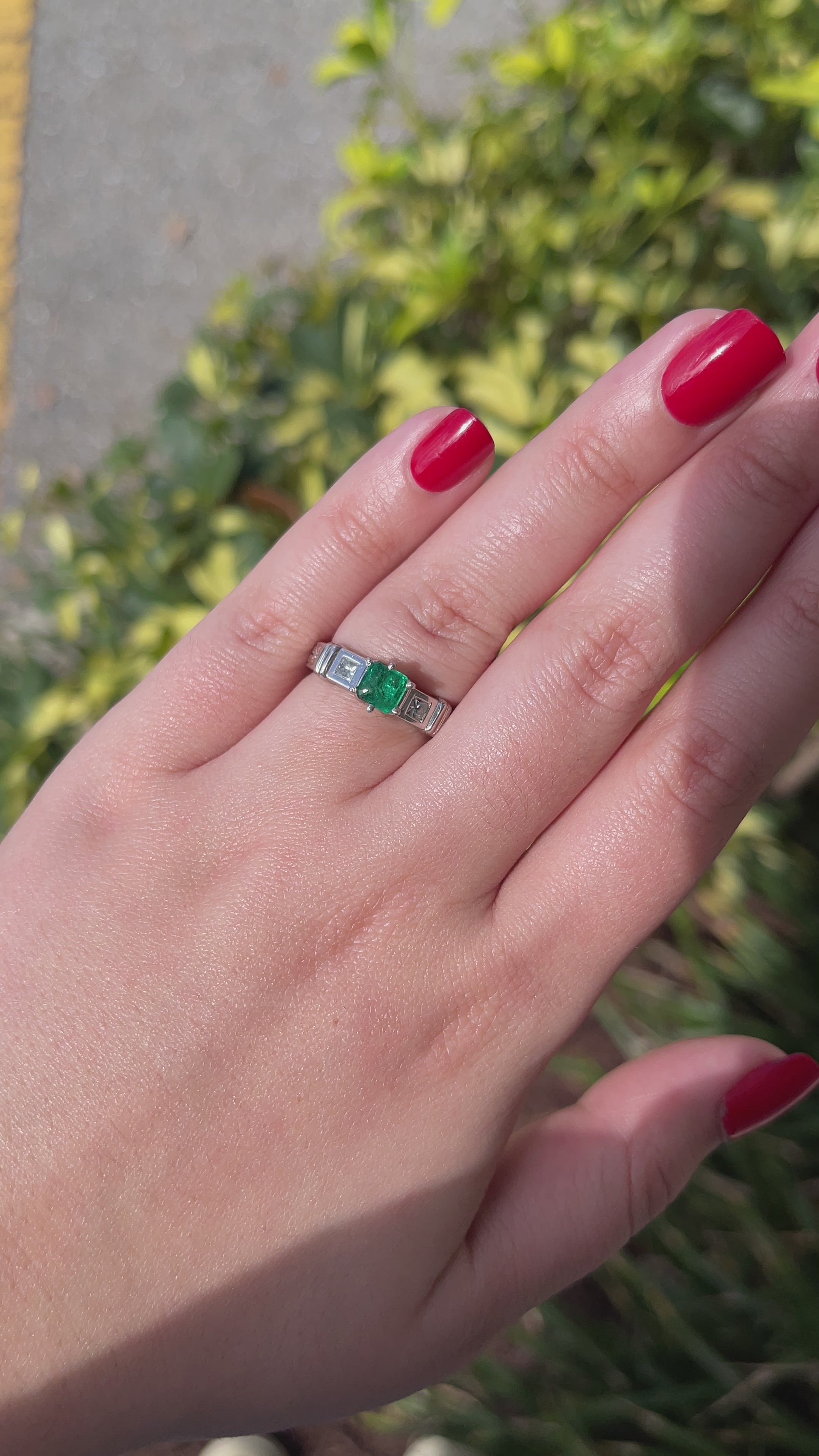 A remarkable emerald and diamond ring. This masterpiece features a desirable emerald green asscher cut emerald in the very center, carried by a six-prong setting. The gemstone in full display showcases high quality, as well as excellent-very good clarity and luster. Two princess-cut diamonds accent the stone on each side, bezel set from within. A floral leaf design weaves down the shank and gives it extra detail to add to this unique piece. Skillfully crafted in 18K white gold.