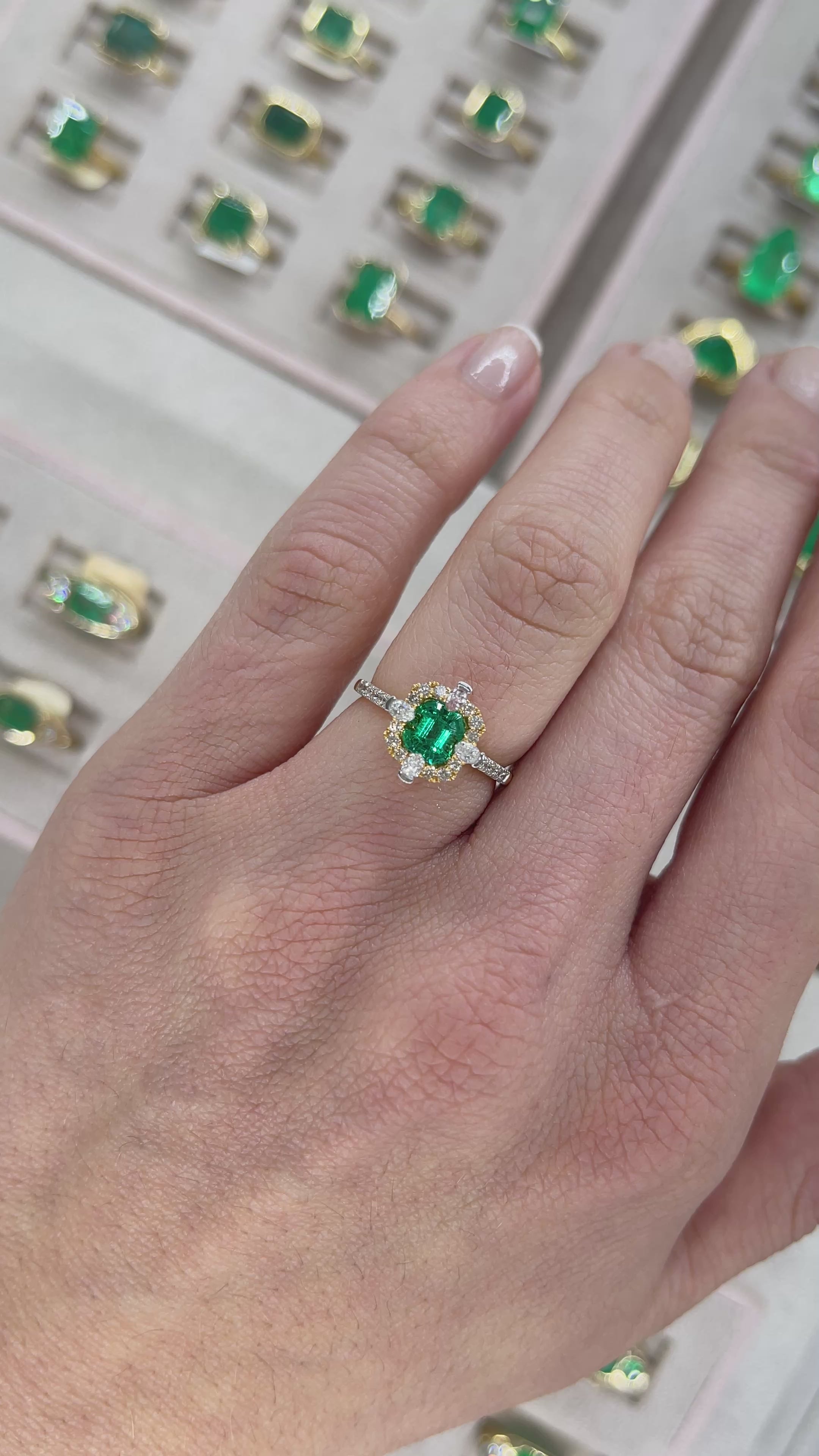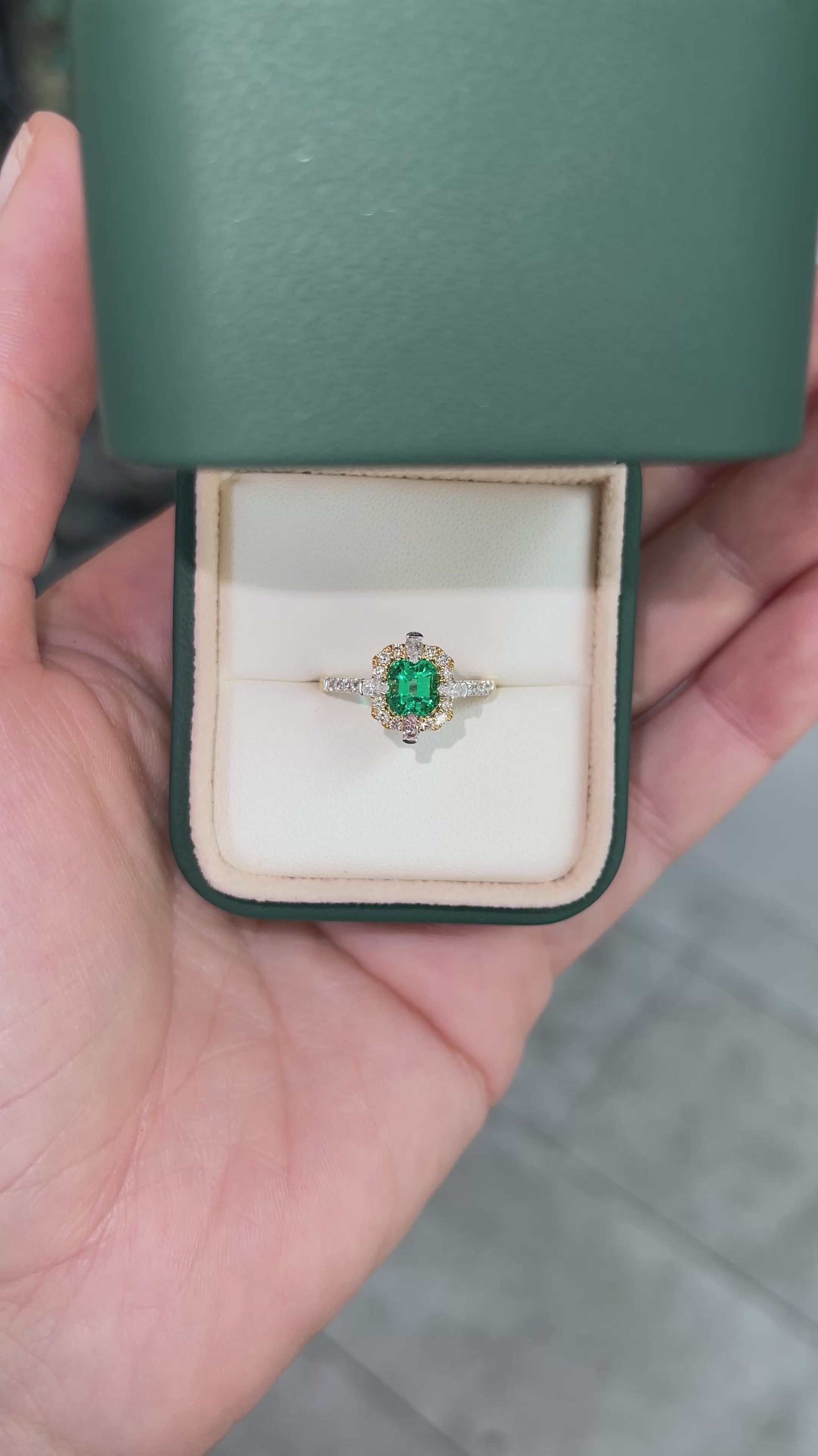 Displayed is an exceptional 1.22 total carat weight two-tone emerald and diamond engagement ring, masterfully handcrafted in 18K yellow and white gold. At its heart rests a AAA+ quality Asscher cut emerald, celebrated for its exceptional color, luster, and crystalline brilliance. The gem’s mesmerizing depth is framed by a halo of pavé set round diamonds, while compass set pear-shaped diamonds grace each side, drawing the eye toward its radiant center.