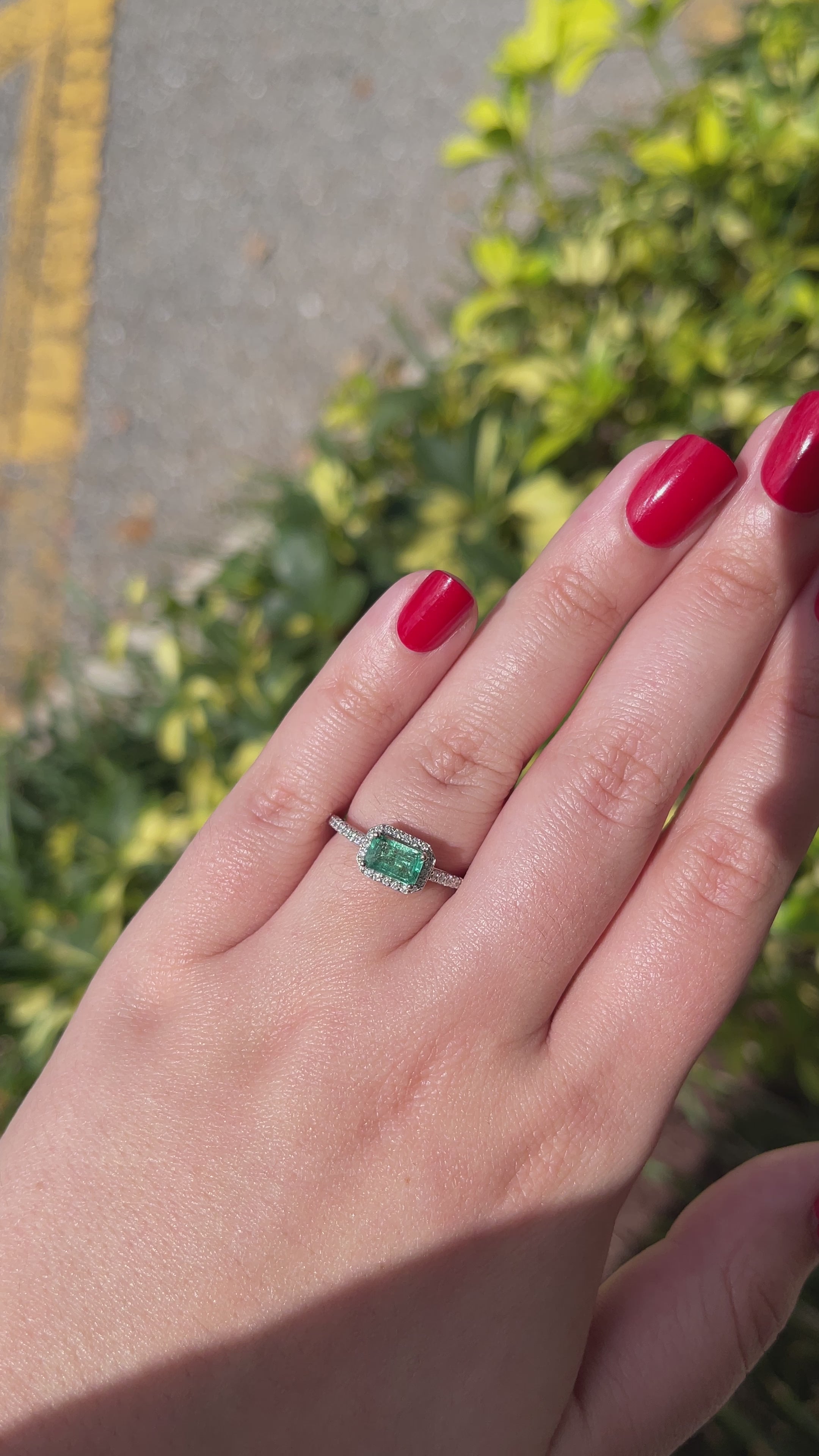 A stunning emerald and diamond engagement ring. The center gemstone features a 0.95-carat, natural Zambian emerald with great qualities. A medium green color, very good eye clarity and luster; set east to west. A diamond halo surrounds the gorgeous gem, as well as a diamond shank accenting the entire piece. Crafted in 14K white gold.
