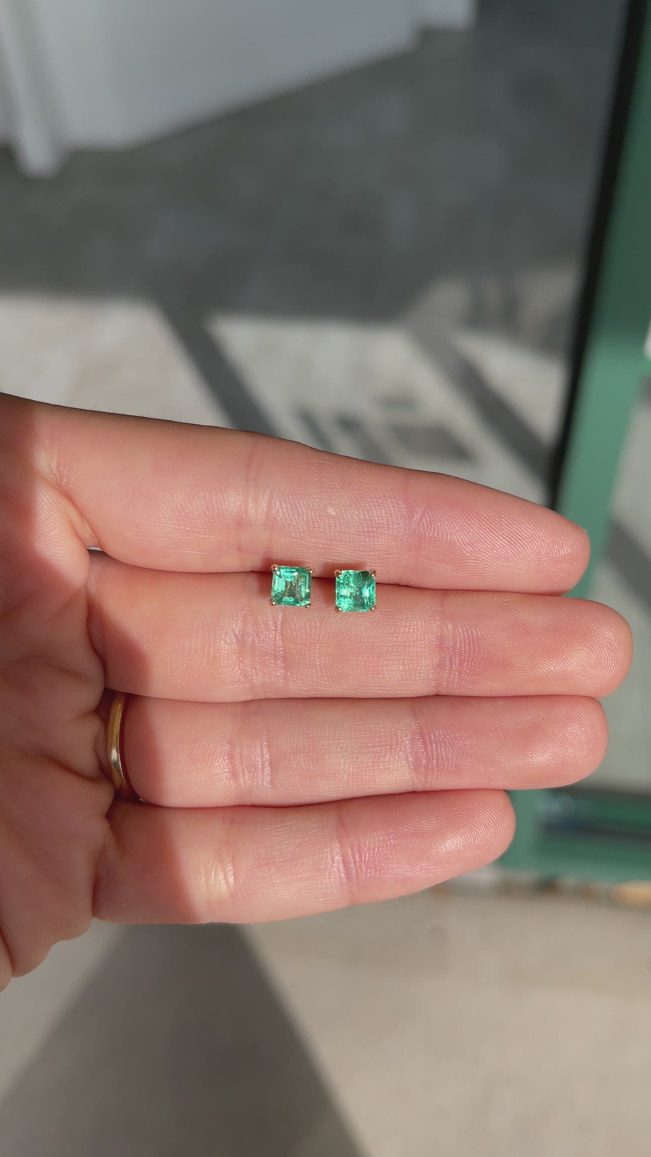 1.39tcw Vibrant Asscher Cut Colombian Emerald Studs 14K Yellow Gold
