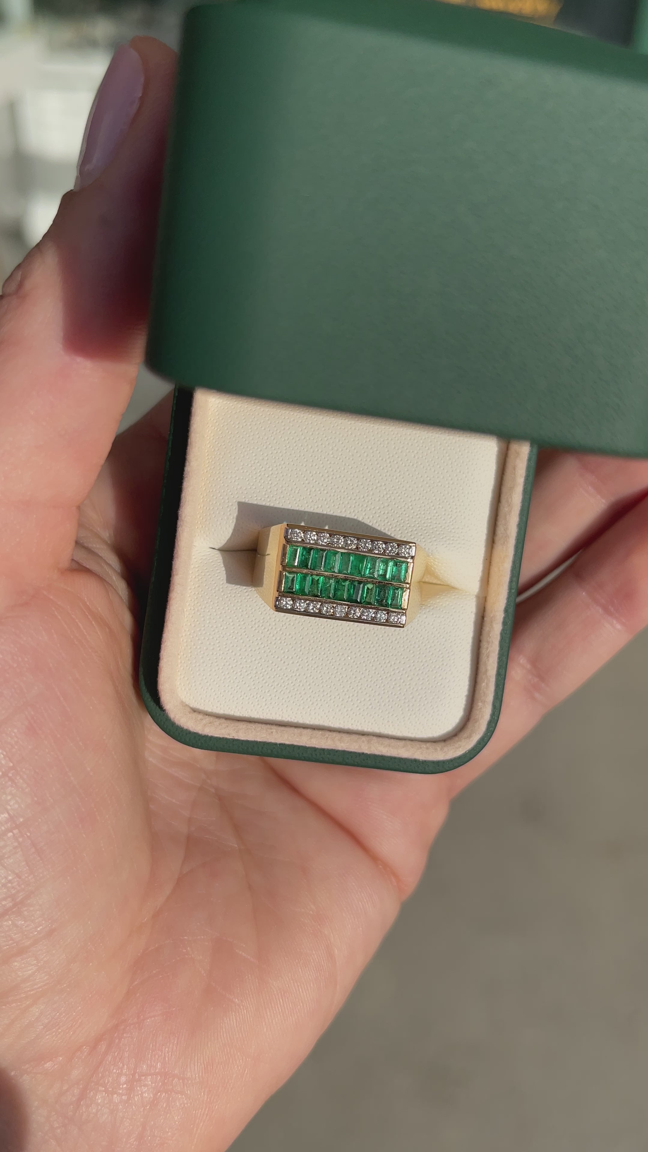Experience the luxury of our 1.41tcw 14K Emerald & Diamond Unisex Band Modern Ring. Adorned with natural baguette-cut emeralds and brilliant round diamonds, this elaborate band offers a modern twist on a classic design. Each hand-selected emerald is of the highest quality, ensuring a truly exceptional piece. The smooth and comfortable wide band makes it perfect for daily wear.