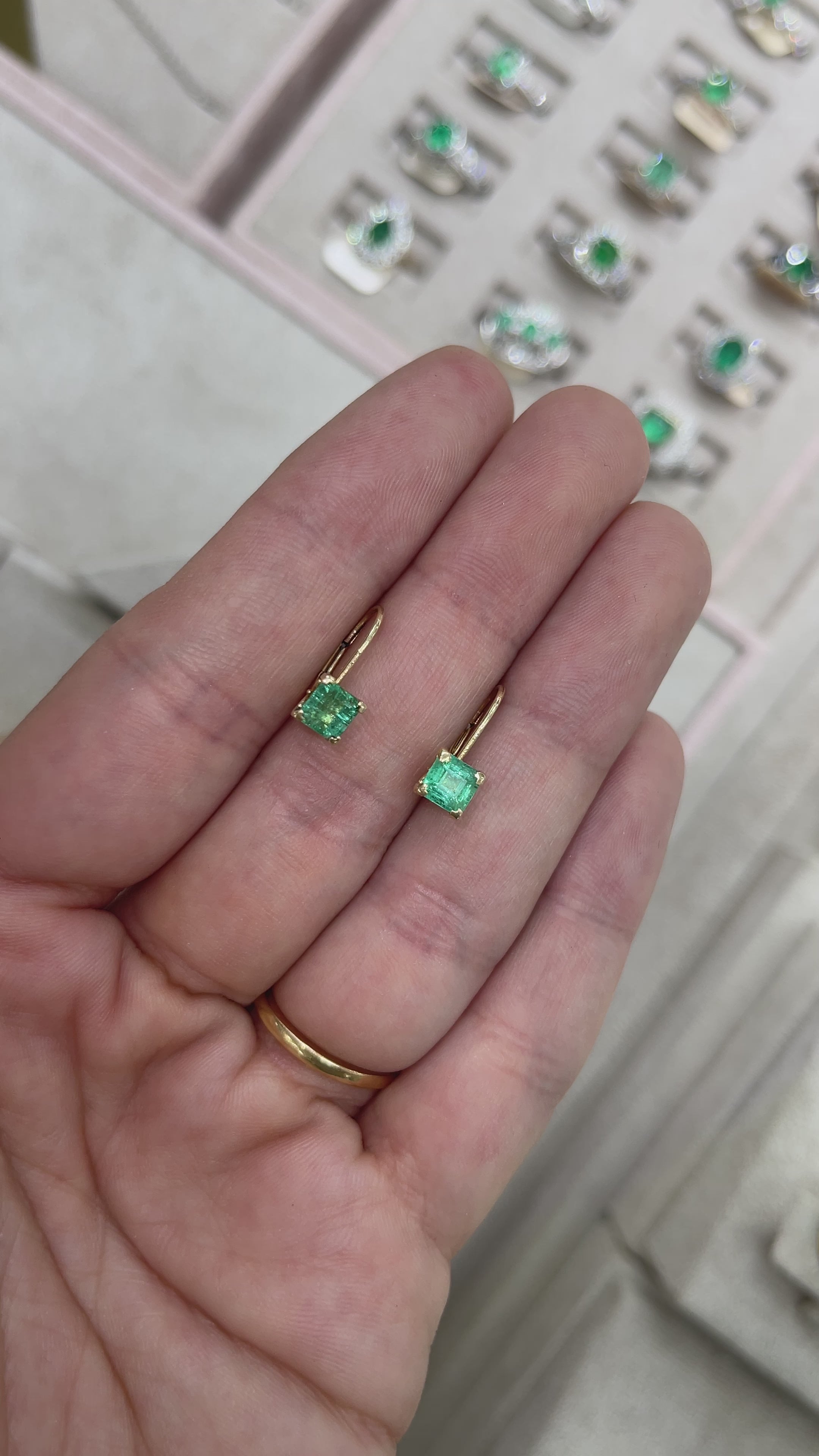 A gorgeous pair of Asscher cut emerald lever-back earrings, hand-crafted in solid 14K yellow gold. The chic pair of dangle earrings feature green, natural emeralds. The rare gemstones have beautiful eye clarity and are simply stunning! The rich medium green emeralds display unique, typical flaws that are normal in all earth-mined gems. The solitaire prong setting shows the beautiful color that the gems have to offer. Ideal earrings for everyday wear!