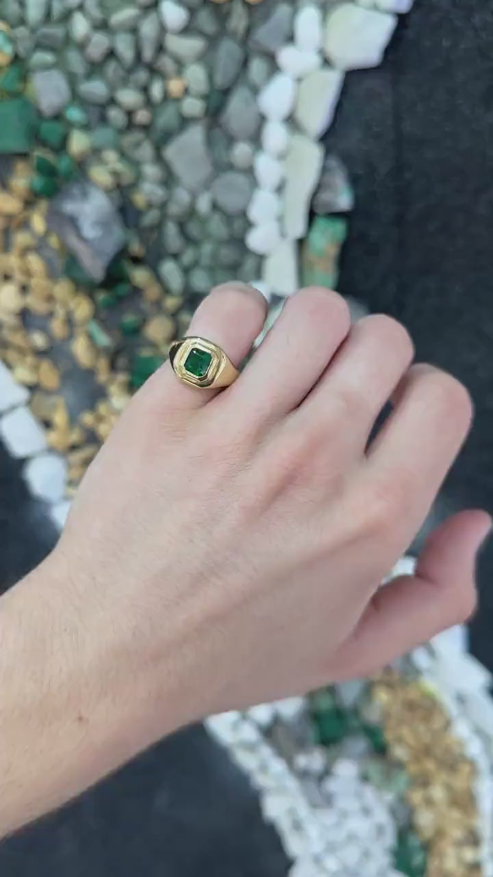 Introducing a captivating unisex emerald solitaire gold ring, featuring a striking 1.48-carat emerald of unparalleled beauty. The emerald boasts an intensely rich dark green color that commands attention, while its unique characteristics set it apart as a truly exceptional gem. Set within a luxurious 18k yellow gold bezel, this ring exudes a timeless elegance that appeals to both men and women, making it a versatile and coveted piece for anyone seeking to adorn their finger with a magnificent emerald statement.