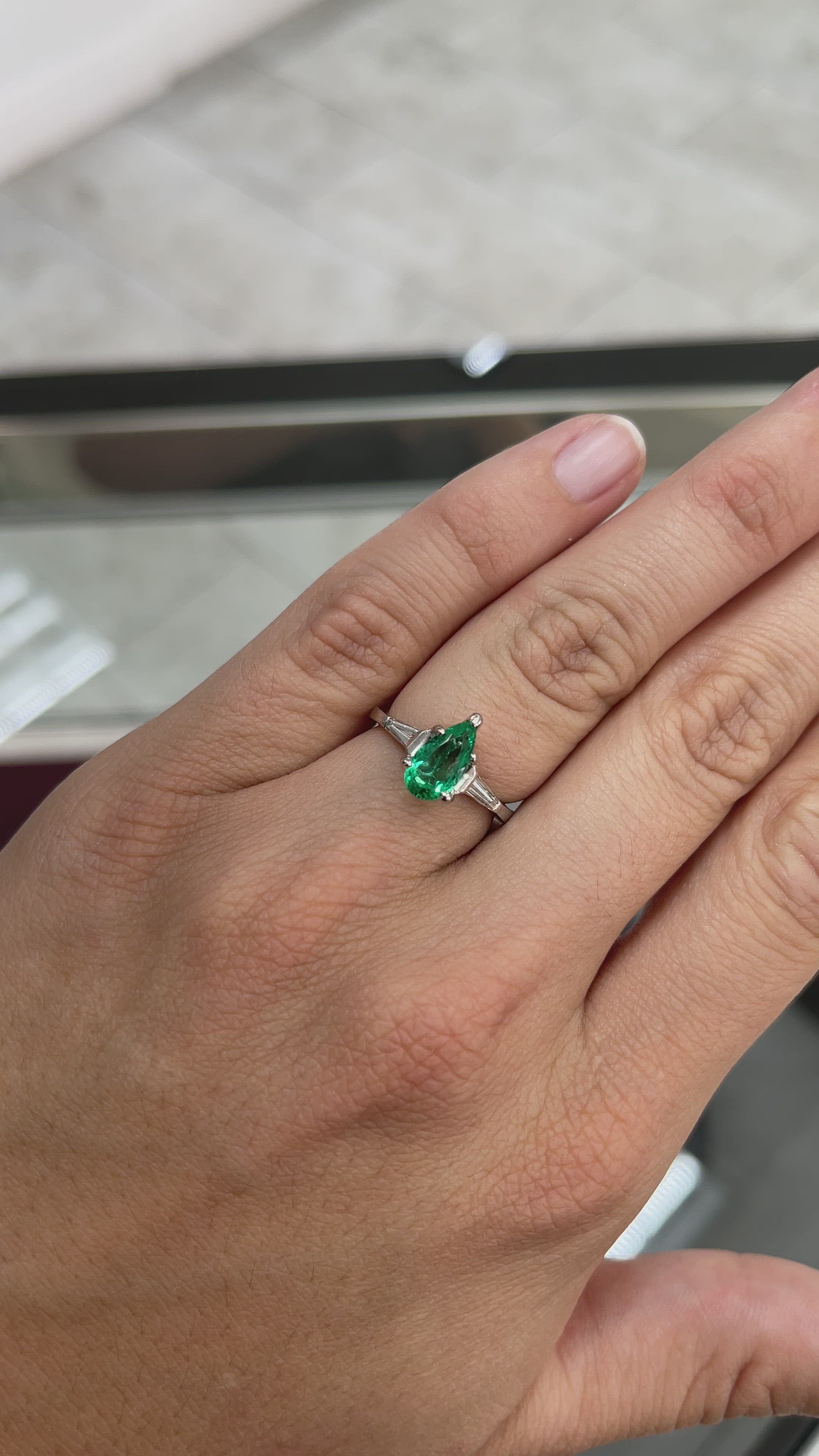 1.49tcw Brilliant Pear Cut Colombian Emerald & Tapered Baguette Diamond Ring 18K