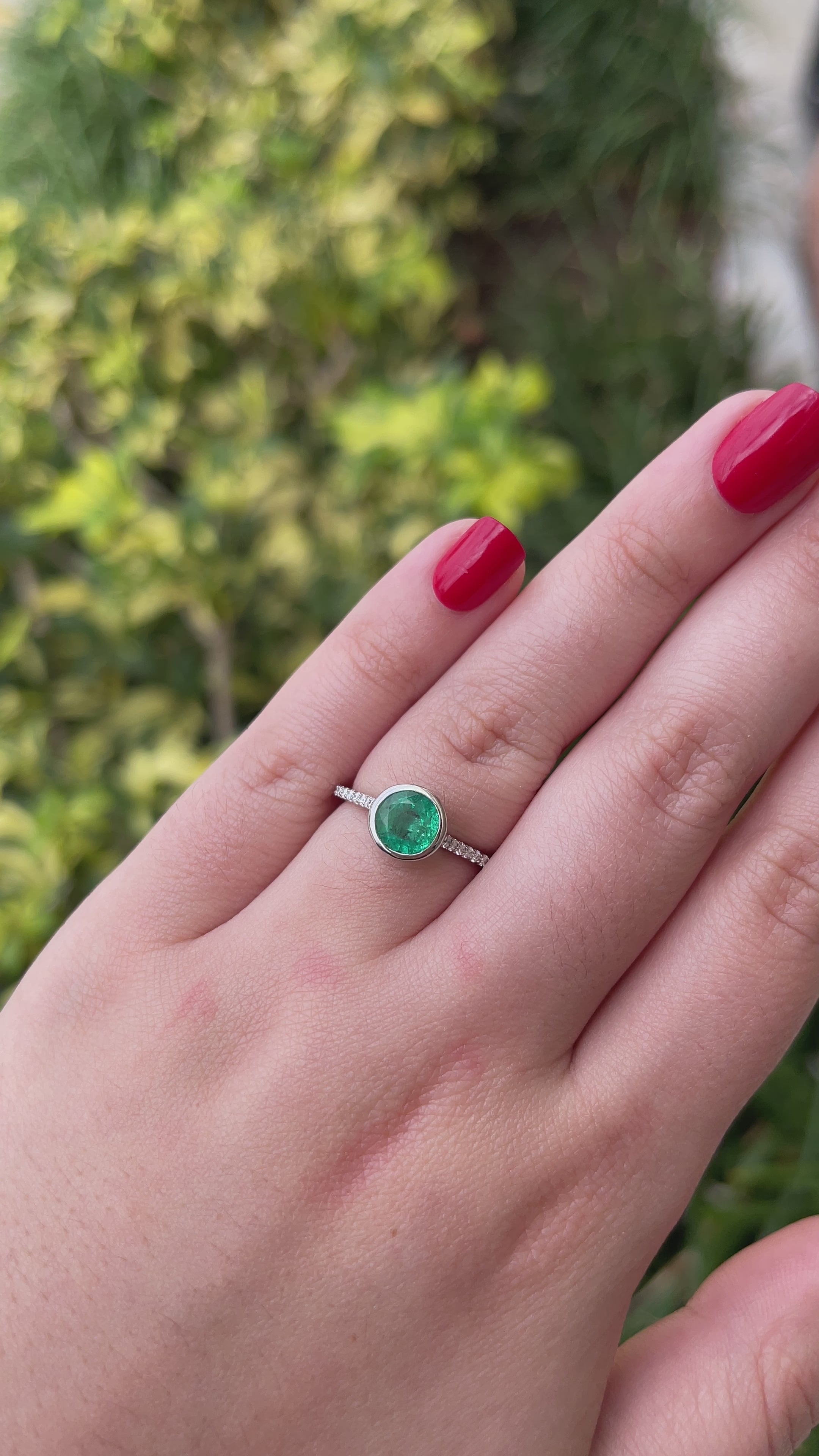 Elevate your style with our Emerald and Diamond Ring, featuring a mesmerizing round cut emerald with a medium dark green hue and semi-transparent clarity, artfully bezel-set to showcase its natural beauty. The diamond-studded shank elegantly encircles the finger, adding a touch of brilliance that extends halfway down the band, creating a seamless blend of sophistication and glamour. Meticulously crafted in lustrous 14k white gold, this ring is a timeless statement piece that effortlessly captures the essence of refined elegance.