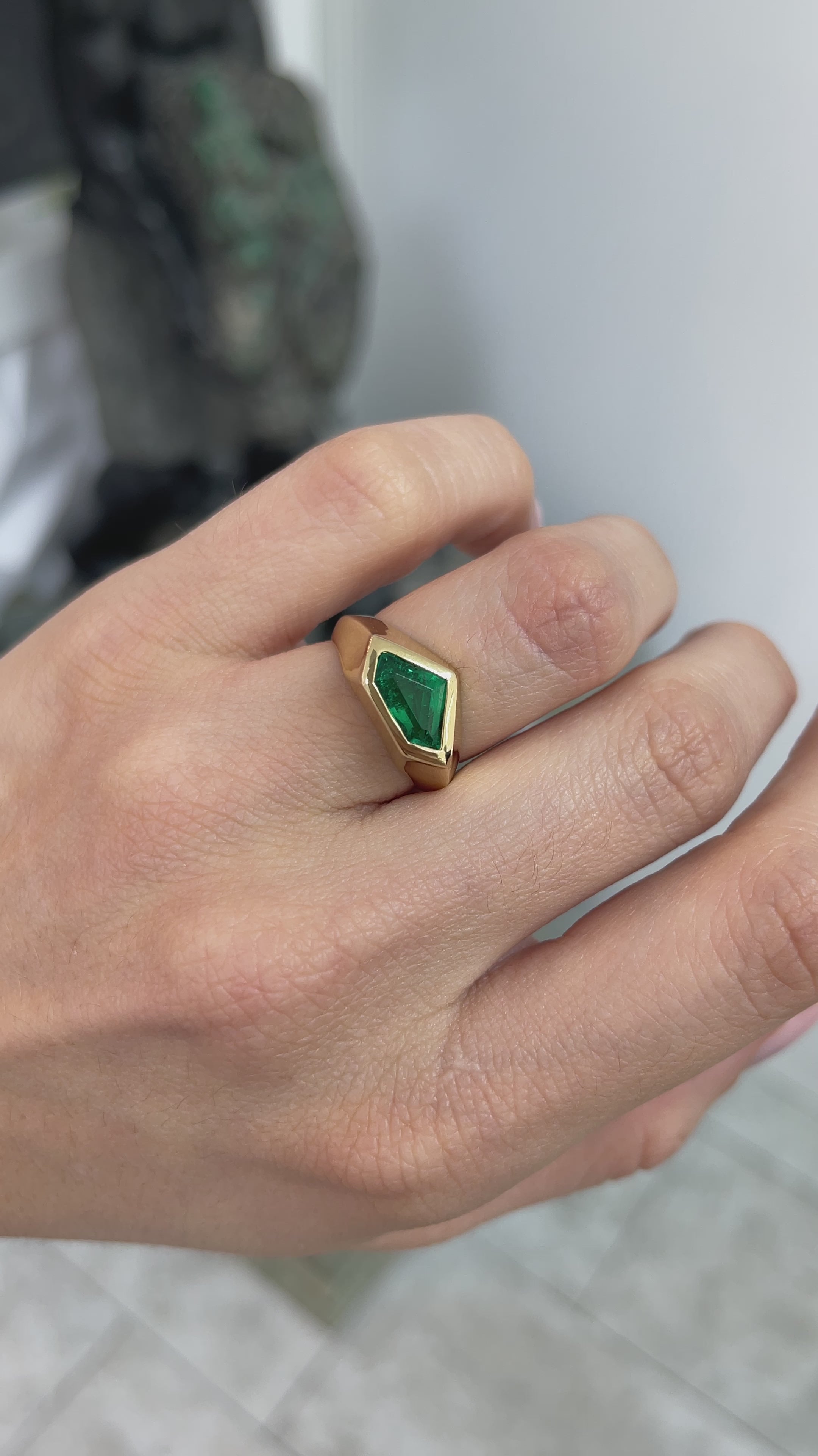 Displayed is a one-of-a-kind, Colombian emerald, superman cut solitaire ring. This custom piece is extremely unique, as having emeralds cut in these rare shapes is very uncommon. This Colombian emerald superman/kite cut showcases a rare, 1.61-carat gem. The emerald is of the highest quality displaying vivid dark green color and excellent luster. The stone is set in a custom 18K yellow gold bezel solitaire setting.