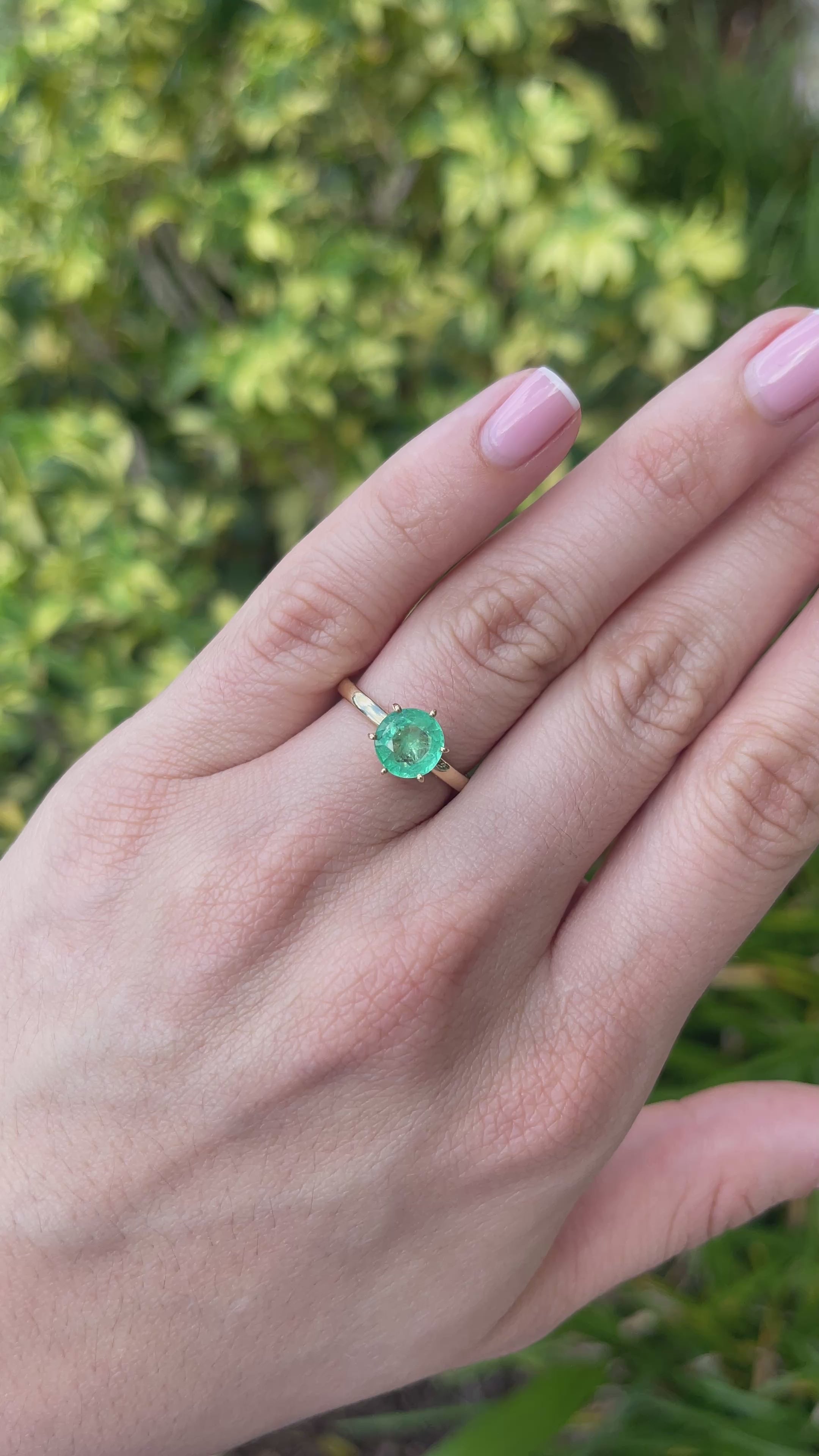 A rare 1.74ct round cut emerald radiates with luminous green fire, set securely in a six-prong crown design that highlights its regal presence. Handcrafted in solid 14K gold, this solitaire ring carries both vintage inspiration and timeless appeal. The round cut, known for its brilliant symmetry, allows light to dance across every facet, giving the stone a glowing energy that feels alive. Our master jewelers take special care to refine every curve and finish, ensuring a smooth, elegant fit that makes this piece perfect for stacking or wearing on its own. A jewel of artistry, passion, and enduring sophistication.