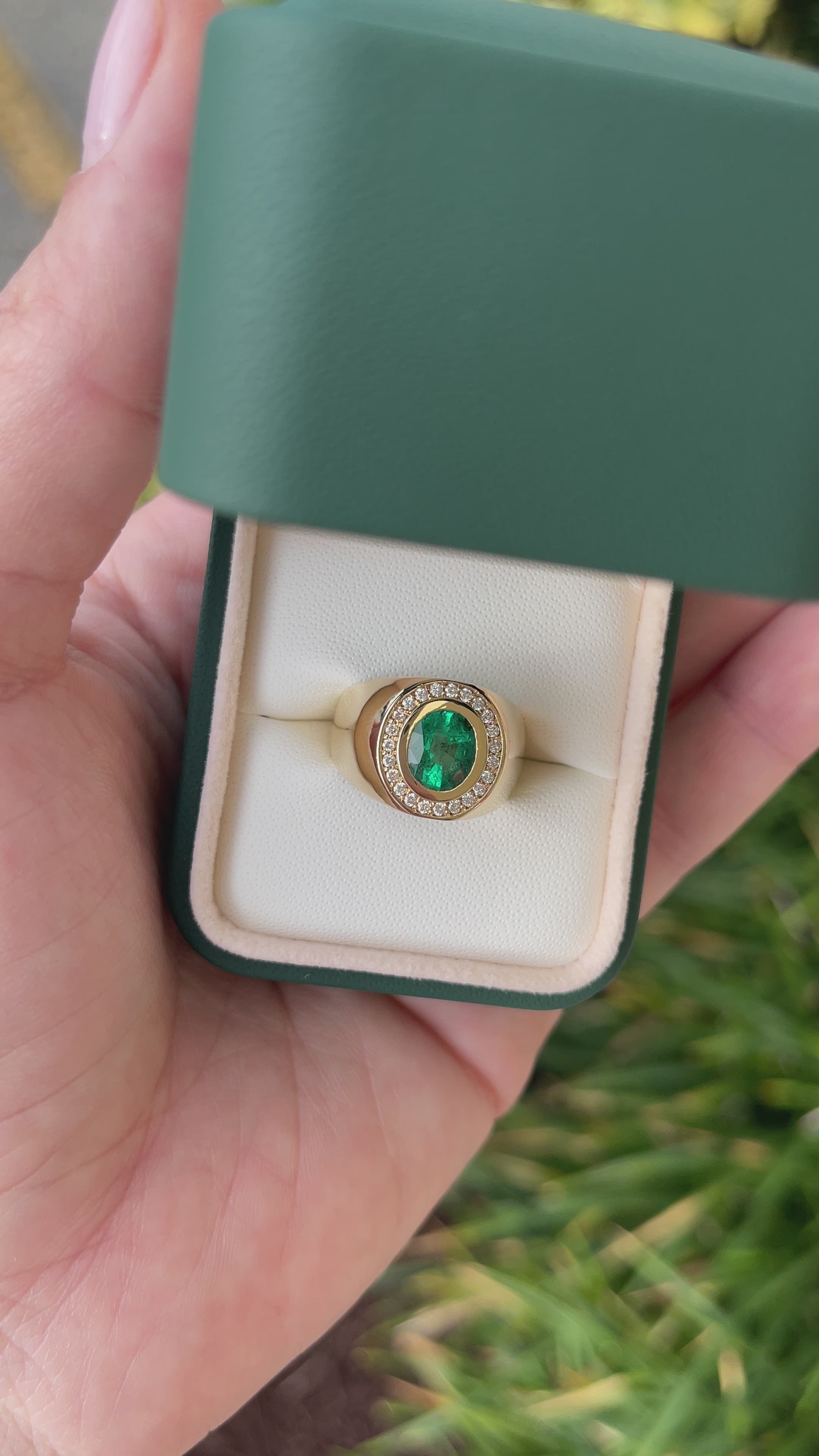 An important emerald and diamond men's cocktail ring. A large 1.70-carat emerald is a bezel set in the very center. The men's ring is made in solid 14K yellow gold and is accented by brilliant round diamonds. This ring has excellent spread and full finger coverage. Smooth and ideal for everyday wear.