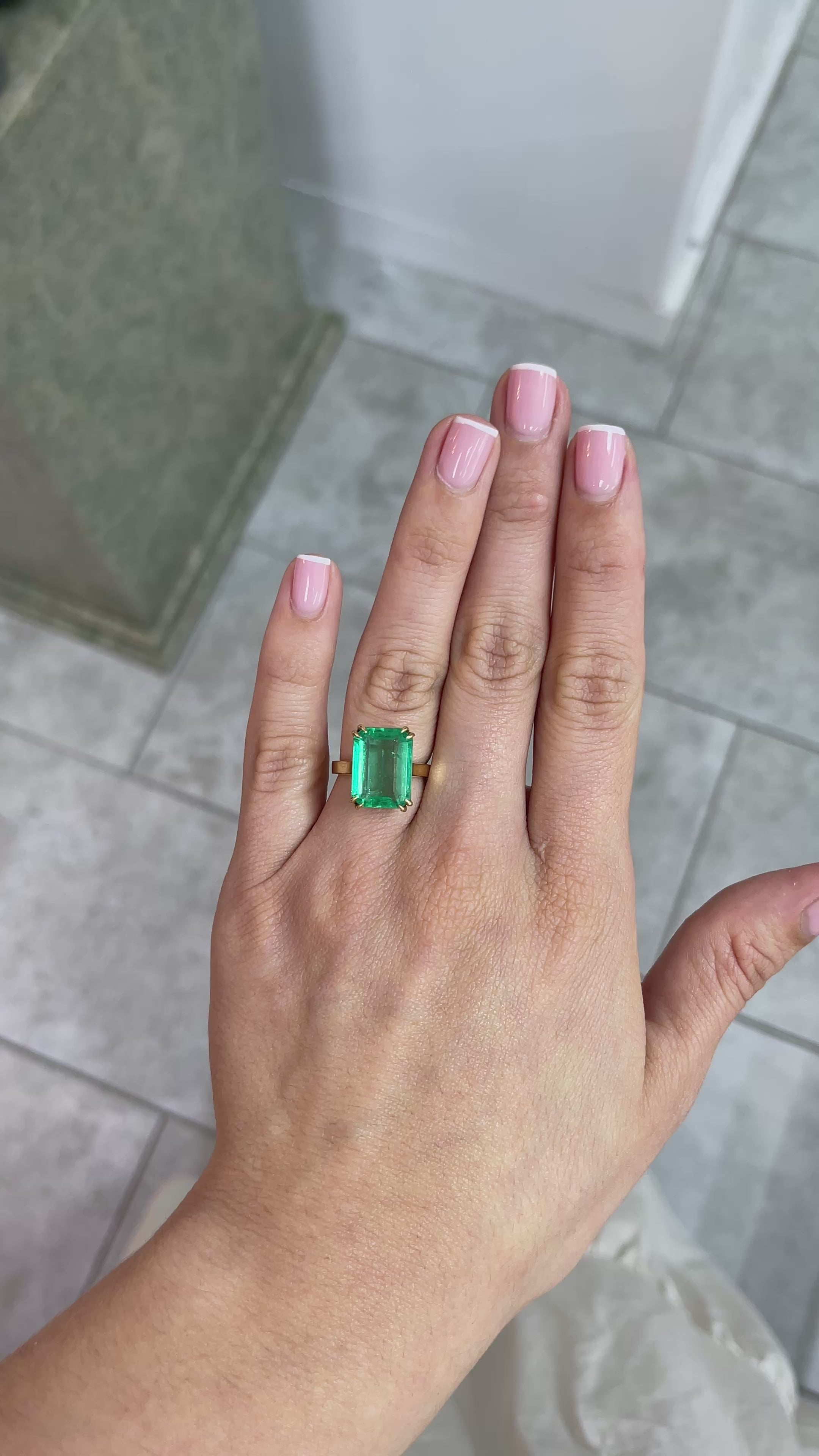 Behold this stunning 10.58-carat Colombian emerald solitaire ring. The large, natural, Colombian emerald weighs a full 10.58-carats. The gem showcases a gorgeous medium green color and almost perfect eye clarity with minor flaws; as these are natural earth-mined gems. Set in custom-made 18K yellow gold, double prong solitaire setting.
