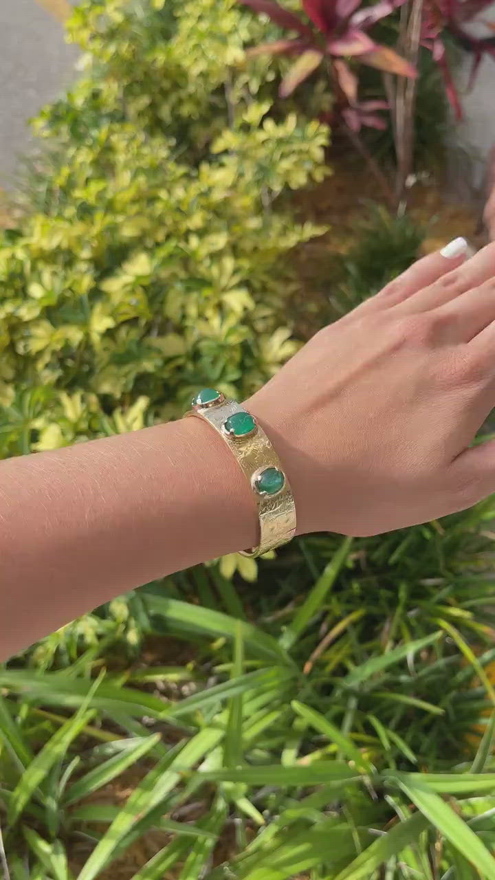 14.82tcw Natural Cabochon Emerald Three Stone Gold Bangle Bracelet 14K