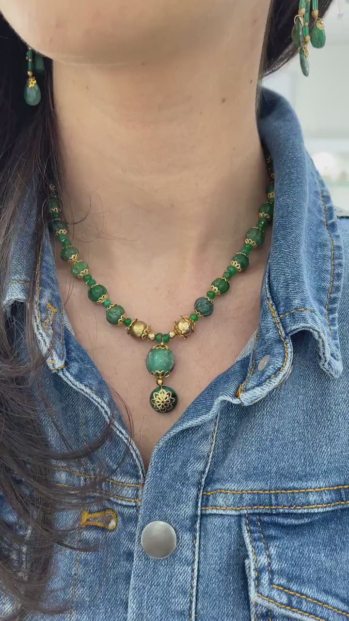 Introducing our exquisite Natural Emerald Carved Beaded Pendant Necklace. This stunning piece features a captivating array of round cabochons, rondelles, and intricately hand-carved emeralds, each meticulously crafted to create a unique and eye-catching texture. The highlight of this necklace is an earthy, breathtaking round cabochon emerald pendant, adorned with beautiful floral golden etchings, set in 14k yellow gold with silver gold plating. This pendant adds a touch of elegance and sophistication to any ensemble. Elevate your style with this statement piece, capturing the raw beauty and allure of natural emeralds in a truly mesmerizing way.