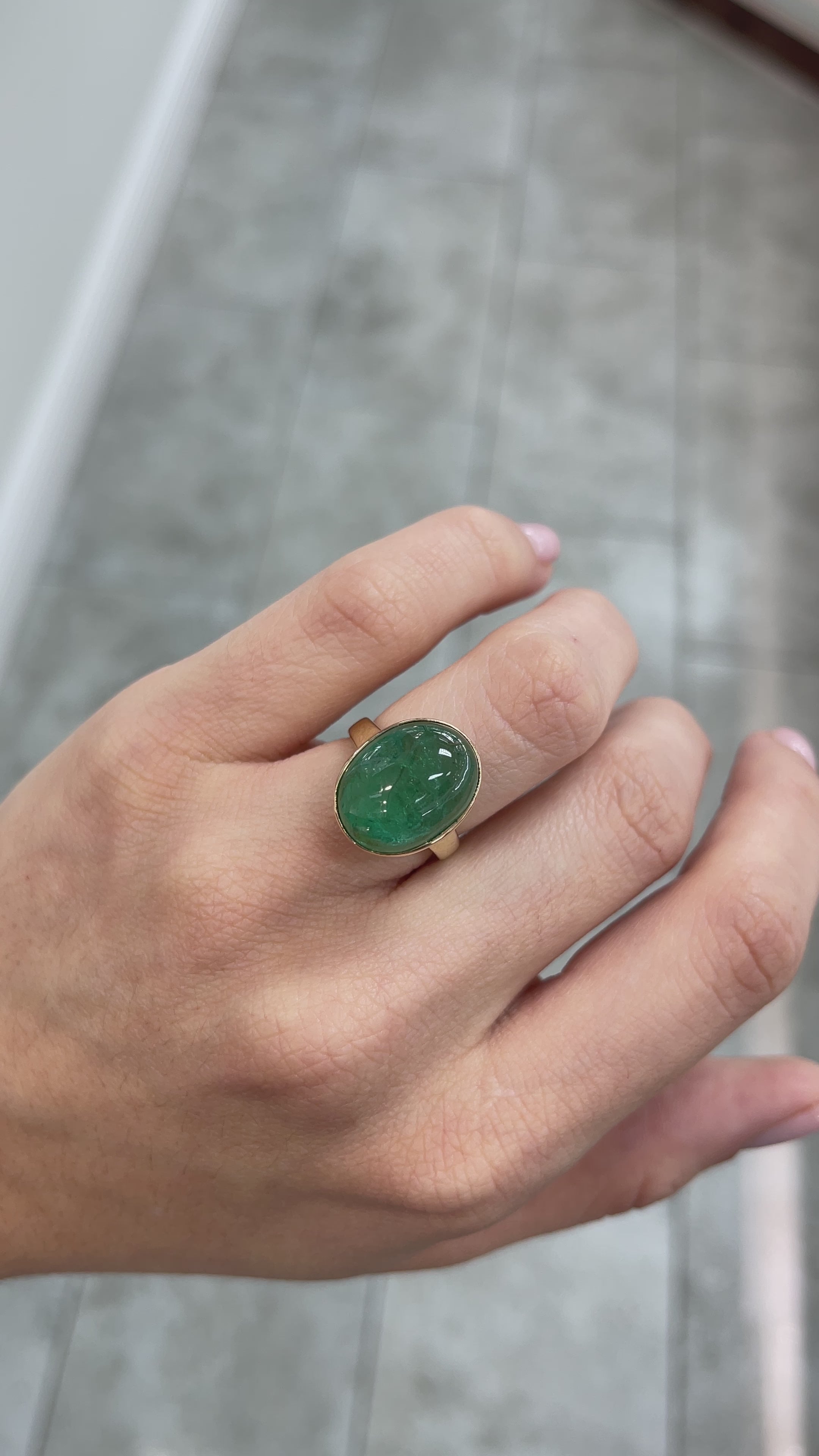 16.37 Carat Large Deep Green Cabochon Emerald Solitaire Bezel Ring 14K