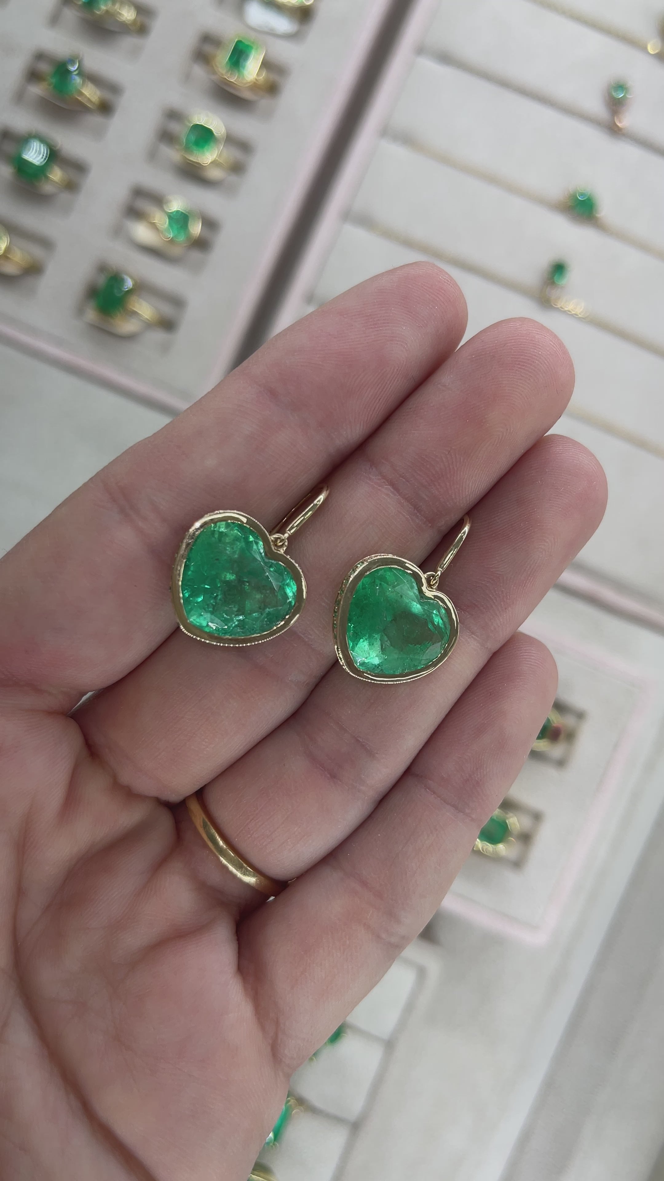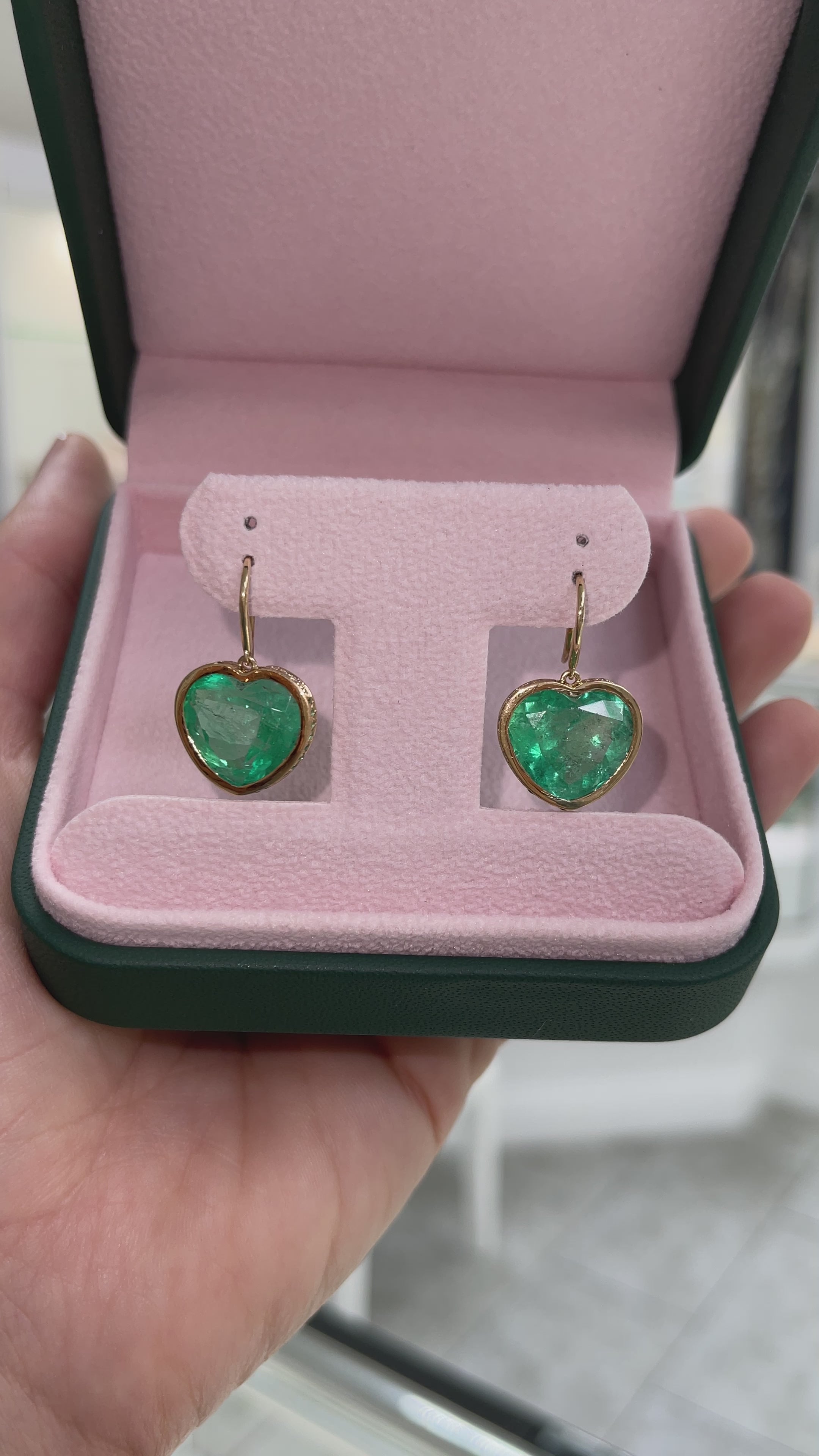 17.40tcw Bubbly Colombian Emerald Heart Dangle Earrings with Ombre Diamond & Emerald Bezel 18K