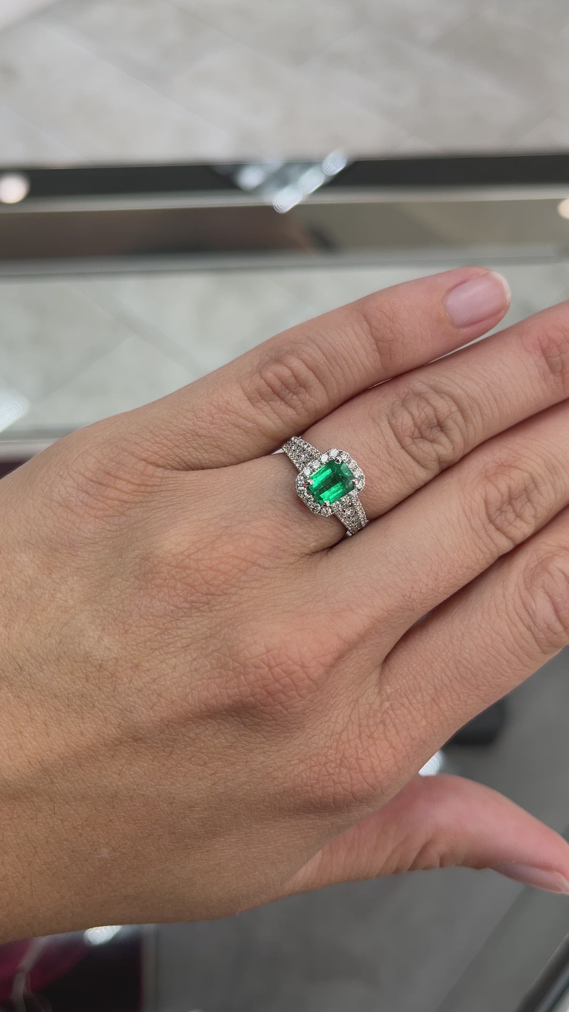 Elegantly displayed is a fine quality, Colombian emerald, and diamond halo engagement ring. The center gem is a high-quality emerald cut emerald filled with life and brilliance! Among the impressive qualities of the emerald, bluish-green color and beautiful eye clarity are seen. Diamonds are firmly pave set in this piece, covering the entire width of the ring with radiant brilliance. The side diamonds are bright near colorless. In addition to their gorgeous bright white luster, the diamonds halo around the emerald exposing beautiful sparkle and life. The ring is made in solid 14K white gold. The ring sits low and will not catch on anything, ideal for everyday use.
