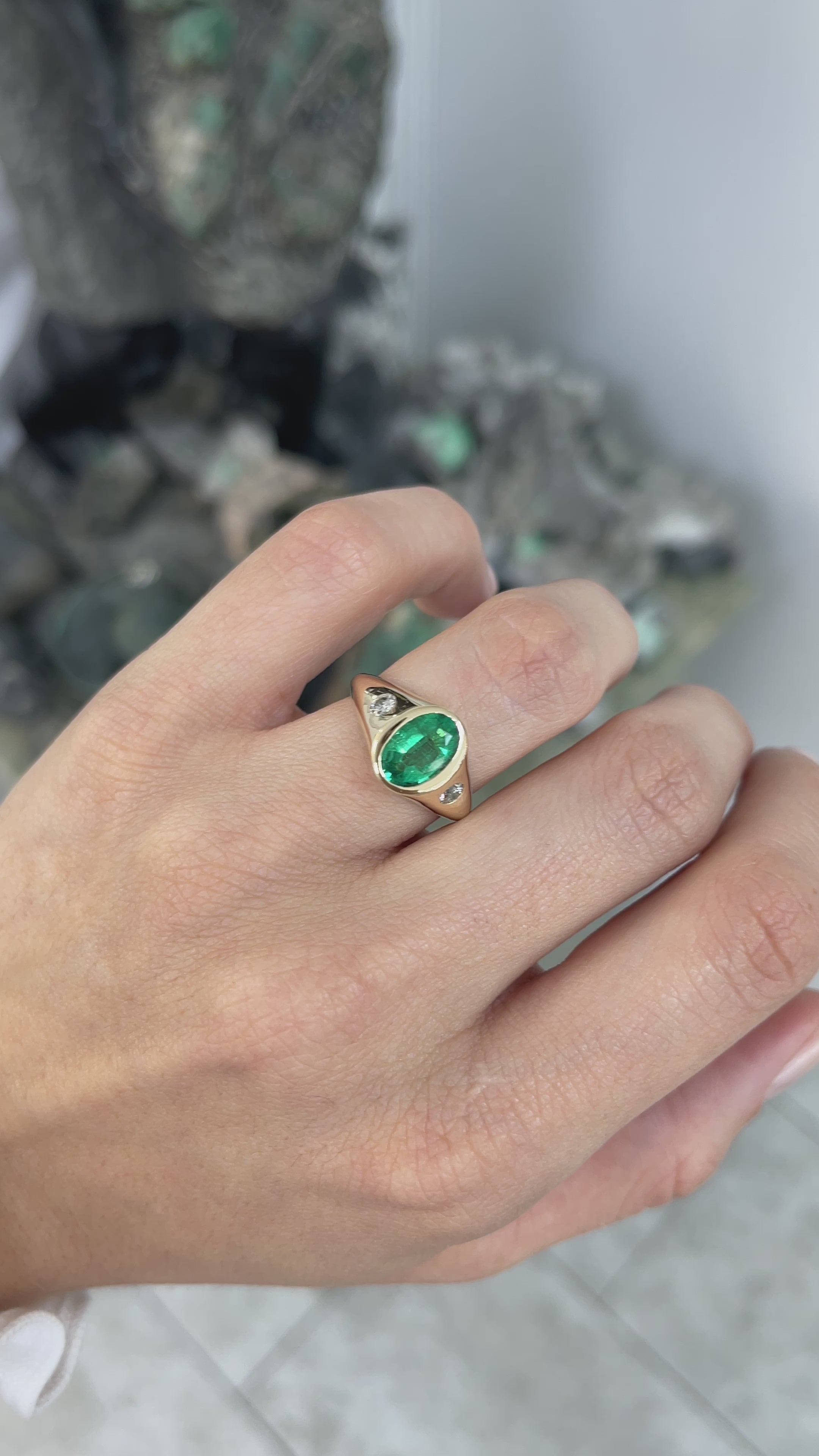 Displayed is a classic Top vivid green emerald & diamond three-stone men's ring in 14K yellow gold. This solitaire ring carries an emerald in a secure bezel setting. Fully faceted, this gemstone showcases excellent shine and brilliance. The emerald has very good clarity with minor flaws that are normal in all genuine emeralds! The gem has a medium-dark green color and very good luster. Diamonds are bezel set on the shank of the ring, creating a classic duo of emerald and diamond. An ideal solitaire, perfect for everyday use!