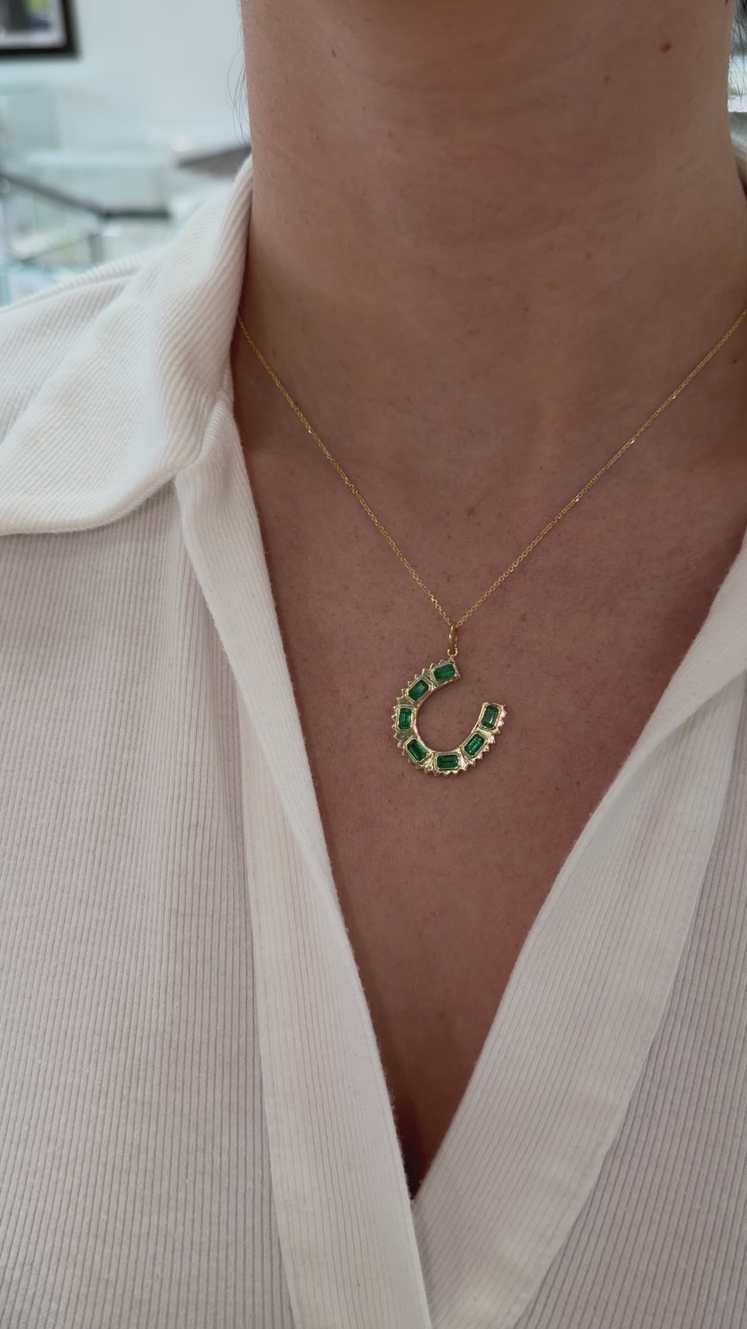2.24tcw 14K Natural Emerald Cut Emerald Horseshoe Charm Pendant Necklace