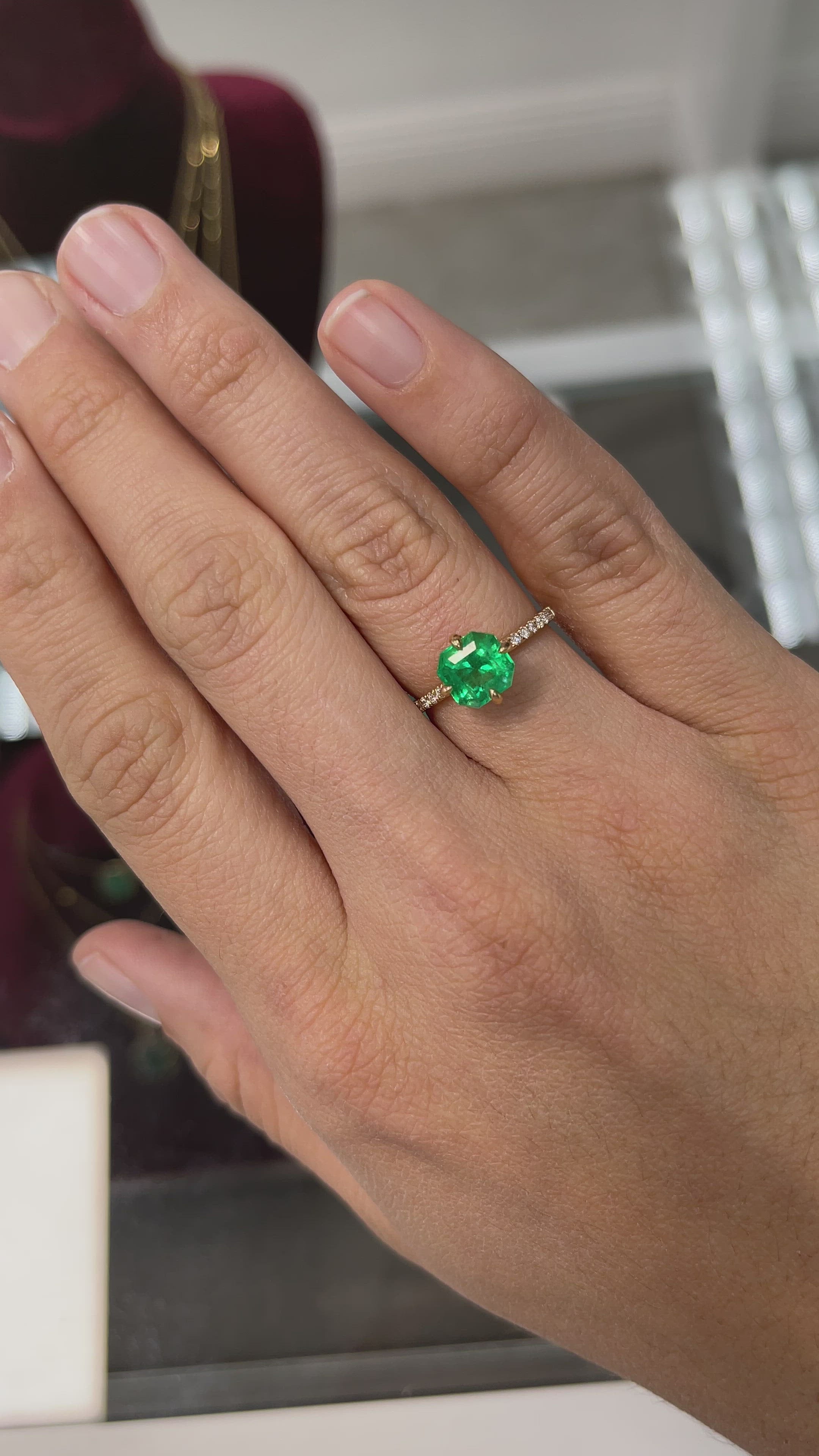 Elegantly displayed is a natural, Asscher-cut Colombian emerald and diamond accent hidden diamond halo ring. The center gem is a fine quality, Asscher cut, emerald filled with life, color, and brilliance! Among the emeralds, impressive qualities are their vibrant color and beautiful eye clarity. This gemstone is impressively clean to the eye and has excellent transparency, which is very rare for these gemstones. Numerous brilliant-cut diamonds are firmly pave set in a hidden diamond halo and on the shank. The diamonds cover the entire width of the ring with wonderful, radiant sparkle. The ring is made in solid 14K yellow. This engagement ring or just statement is simply perfect!