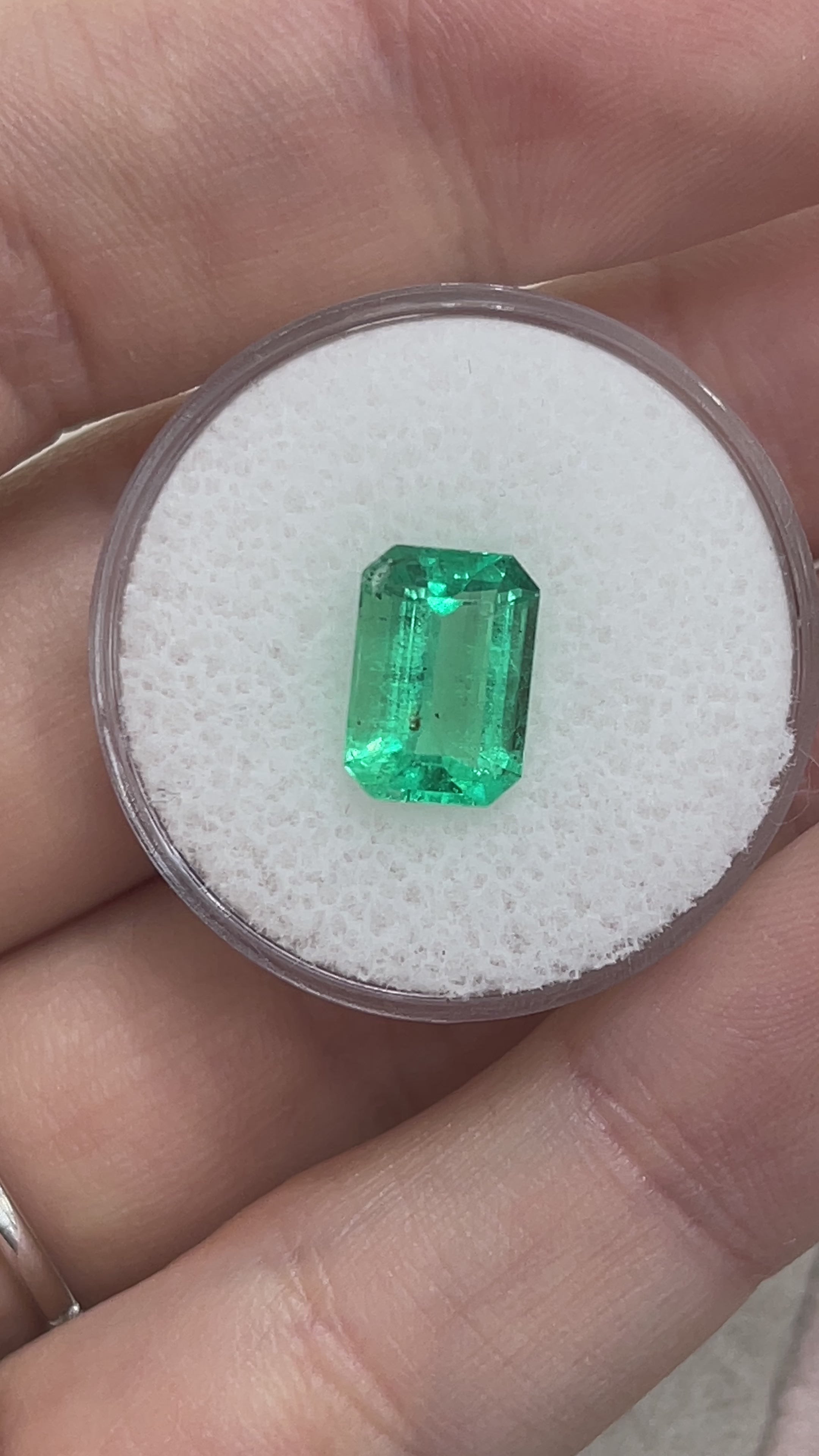 2.31 Carat 10x7 Freckled Medium Green Emerald Cut Colombian Emerald