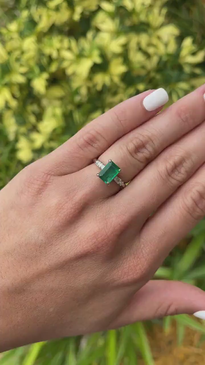 A stunning emerald and diamond engagement ring. The center stone features a four-prong set, 2.11-carat natural Zambian in emerald cut; displaying a rich dark green color and exceptional luster. Two princess-cut diamonds can be seen accenting both sides of the stone. This five-stone ring is crafted in gleaming 14K white gold.