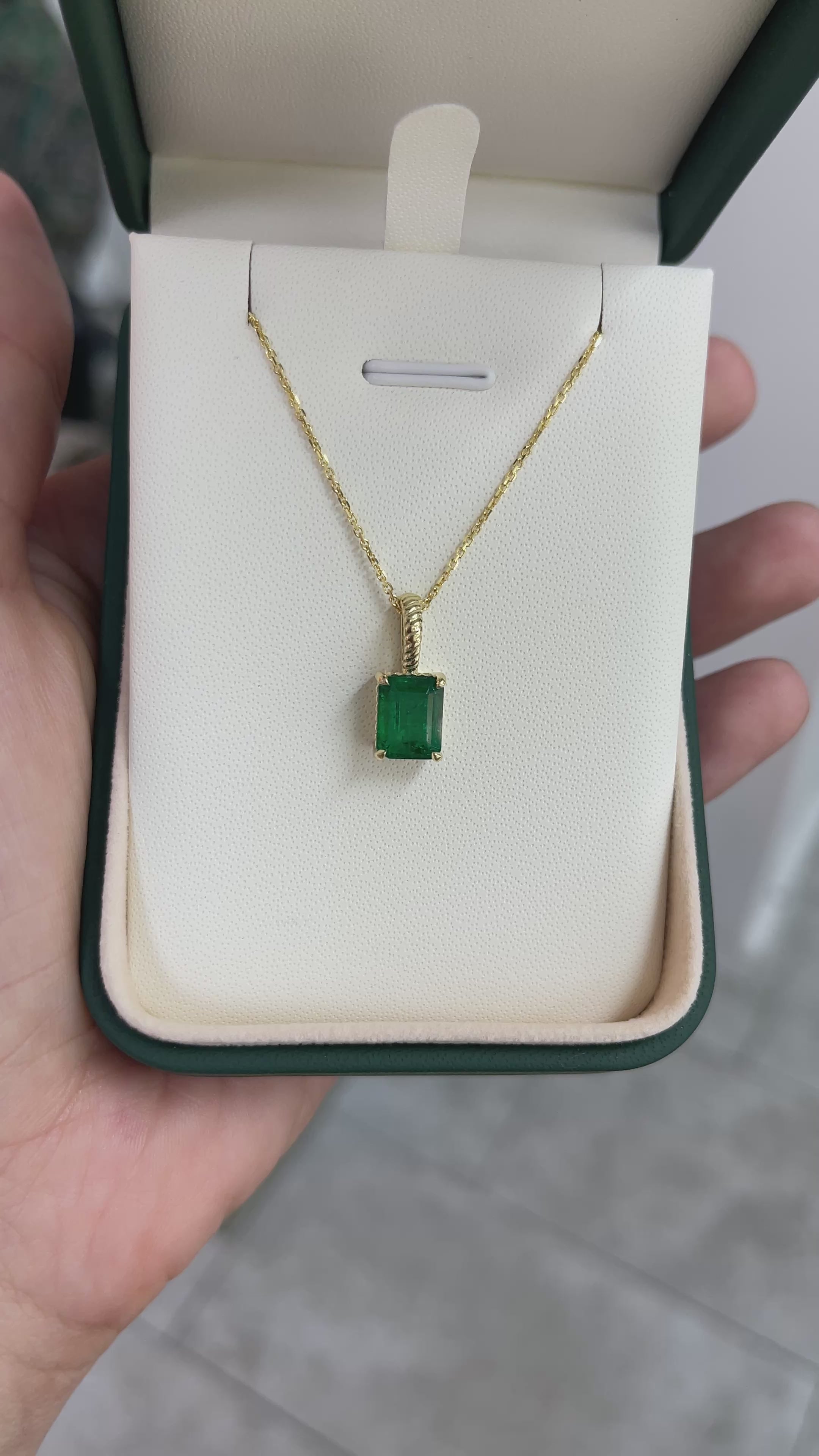 Featured here is a stunning emerald cut Zambian emerald pendant in fine 14K yellow gold. Displayed in the center is a deep-green emerald with very good clarity, accented by a simple four-prong gold mount, allowing for the emerald to be shown in full view. The earth-mined, natural emerald has a nice green color with excellent qualities. This piece comes with an 18-inch, 14K yellow gold cable chain, as shown.