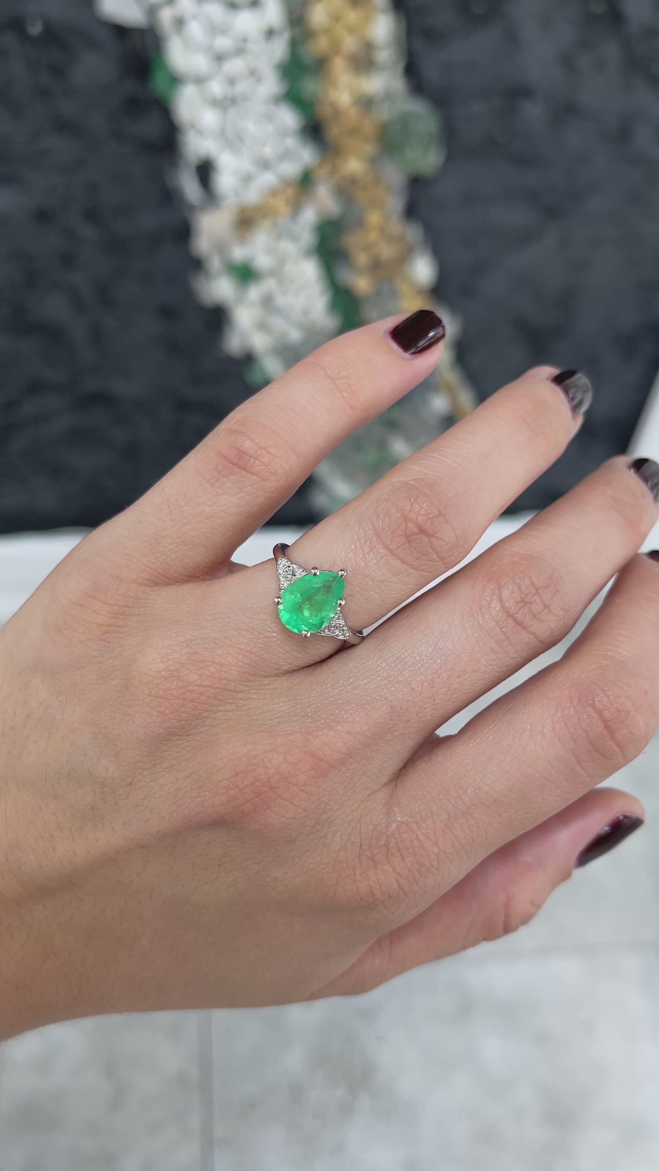 A captivating pear-shaped Colombian emerald takes center stage in this elegant ring, radiating a vivid yellowish-green hue that is both rare and enchanting. The emerald is securely held by six prongs, allowing its natural beauty and lively glow to shine from every angle.