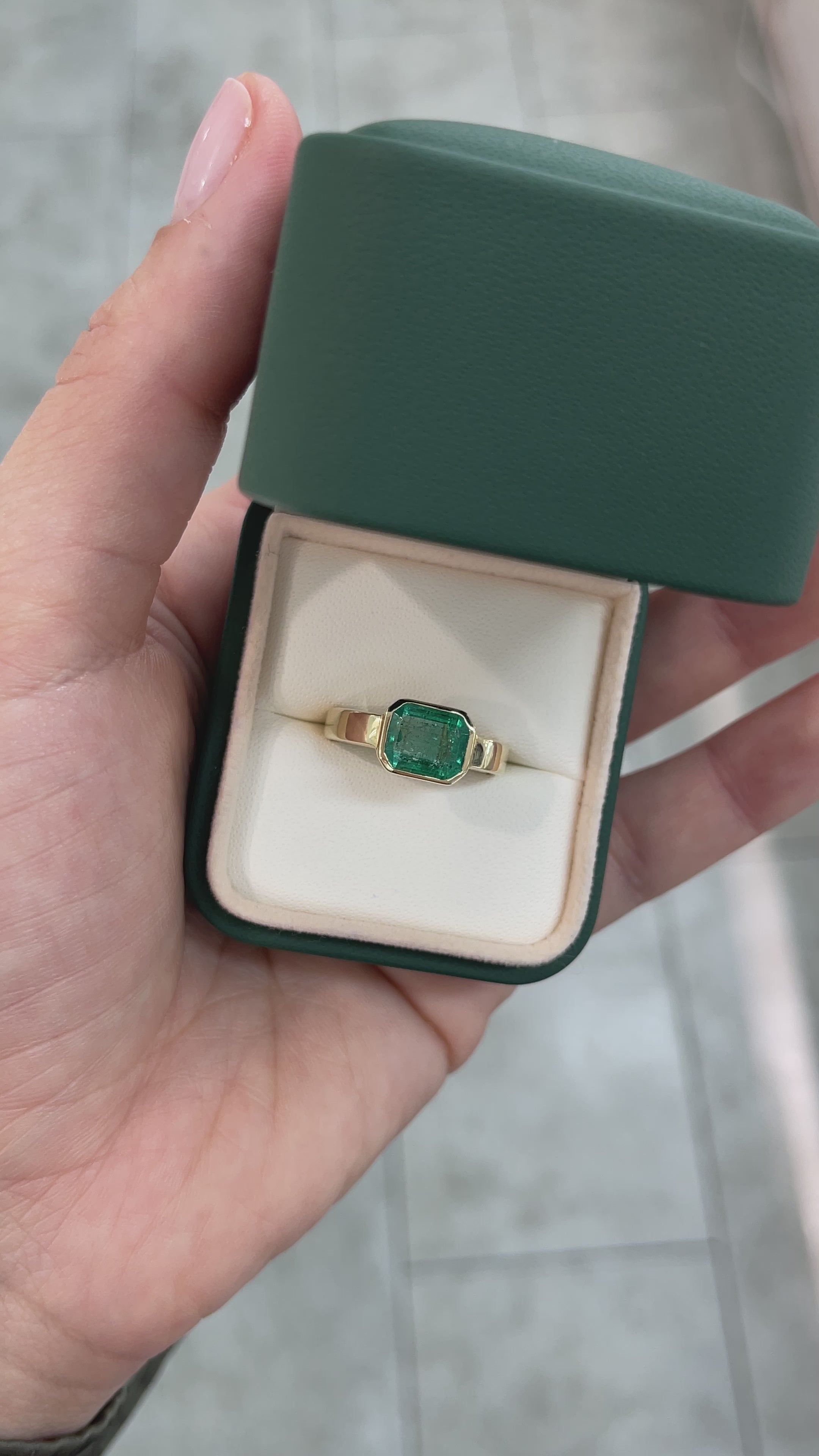 Displayed is a stunning East to West emerald solitaire engagement or right-hand ring in 14K yellow gold. This gorgeous solitaire ring carries a 2.40-carat emerald in a bezel setting. Fully faceted, this gemstone showcases excellent shine and beautiful, rich green color. The emerald has very good clarity with minor flaws that are normal in all genuine emeralds! This earth mined emerald has a rich, bluish-green color, and excellent luster. An ideal solitaire, perfect for everyday use!