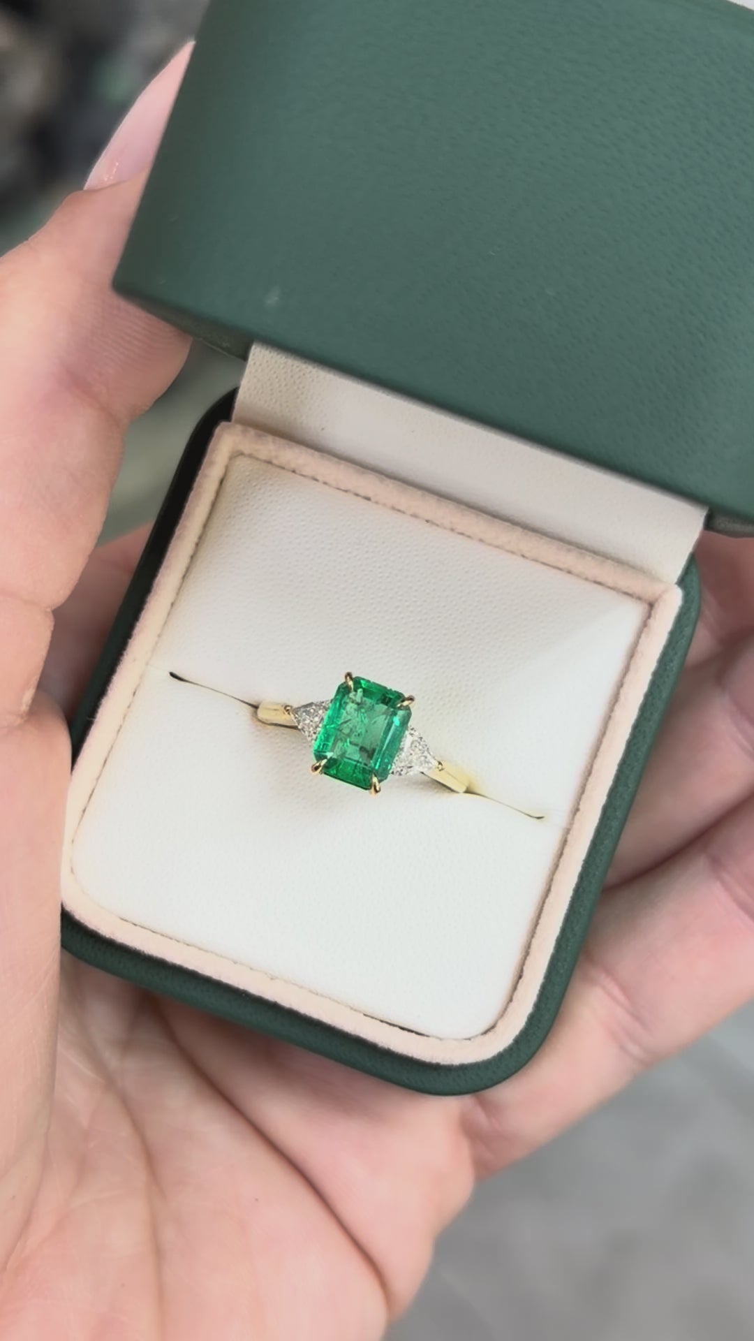 A luxurious earth mined emerald and natural diamond three-stone ring. This magnificent classic piece features a remarkable emerald cut emerald from the well known origin of Zambia as the center stone. The rare gemstone displays a medium-dark, desirable emerald green color with very good transparency and luster. Accenting the center, are two trillion cut diamonds. One on each side, showcasing a dazzling sparkle. Carefully skillfully crafted and handset in gleaming 18K yellow solid gold.