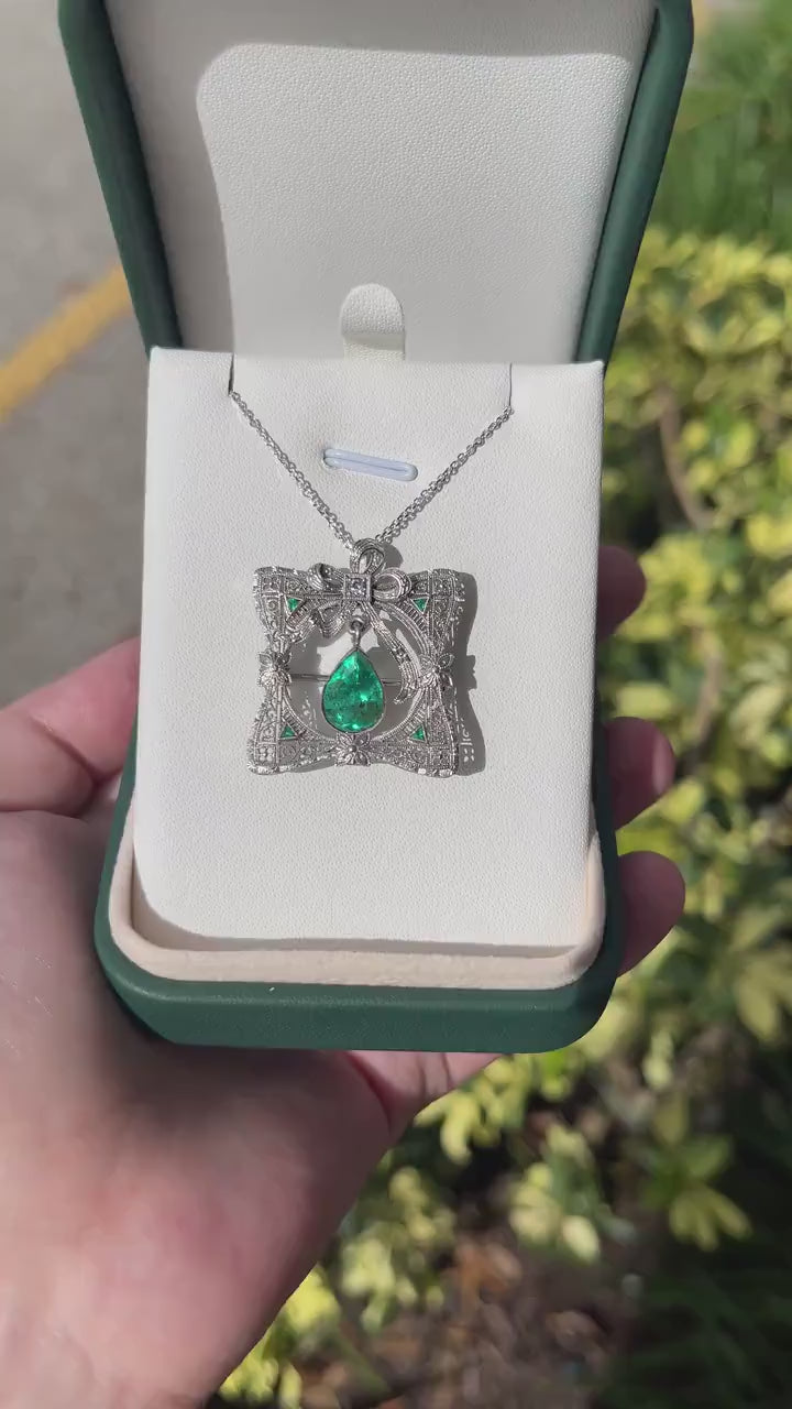 This exquisite multifunctional brooch and pendant is a true vintage treasure, likely dating back to the early to mid-1900s, showcasing an elegant, timeless design. At its center, a bezel-set, pear-cut Colombian emerald with a rich green hue dangles gracefully, displaying unique jardin and carbon inclusions that enhance its character. Petite triangle-cut emeralds accent the four corners, while a petite antique round diamond adds a delicate touch at the top, all meticulously crafted in 14k white gold with a ribbon-inspired motif.