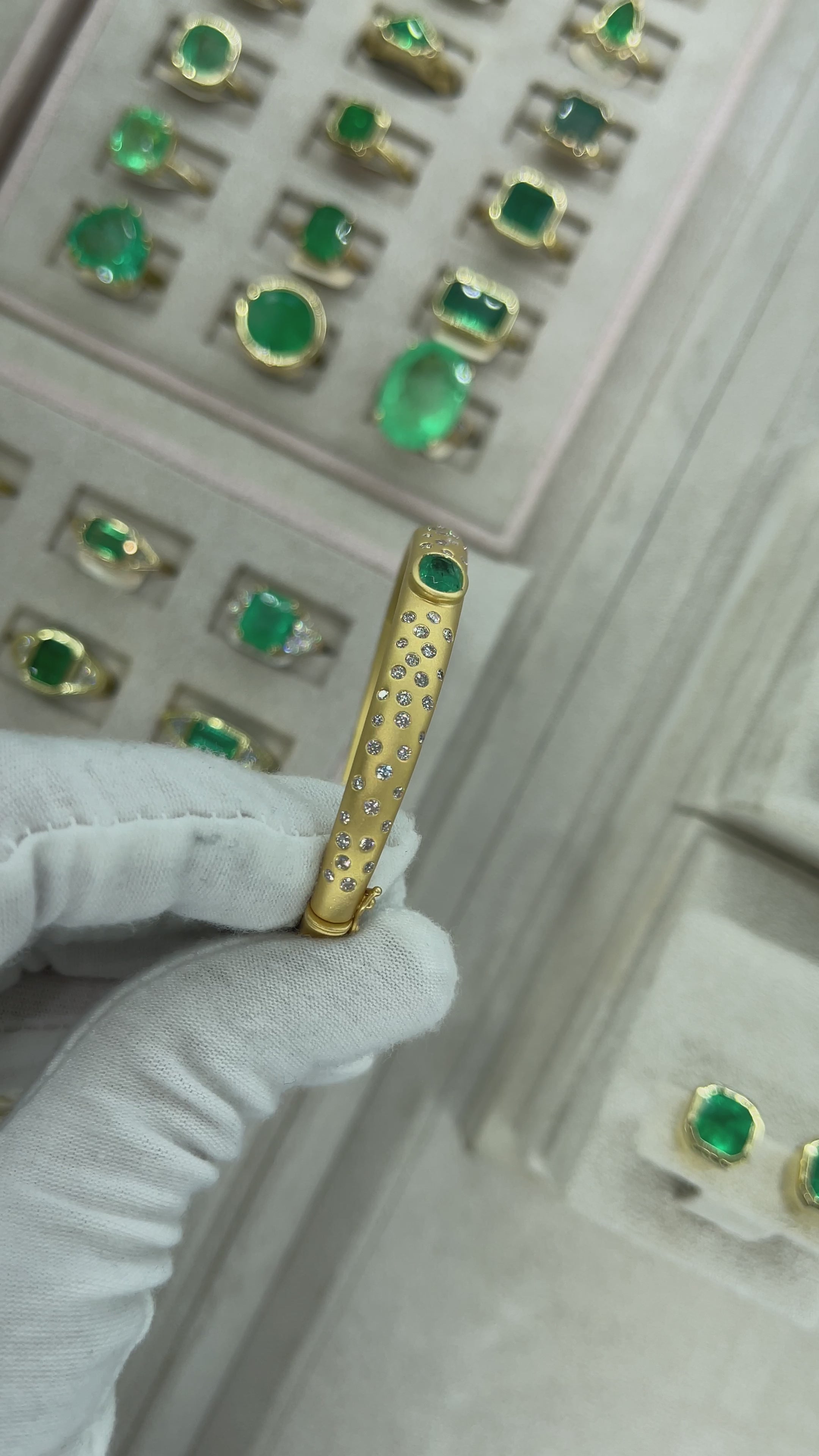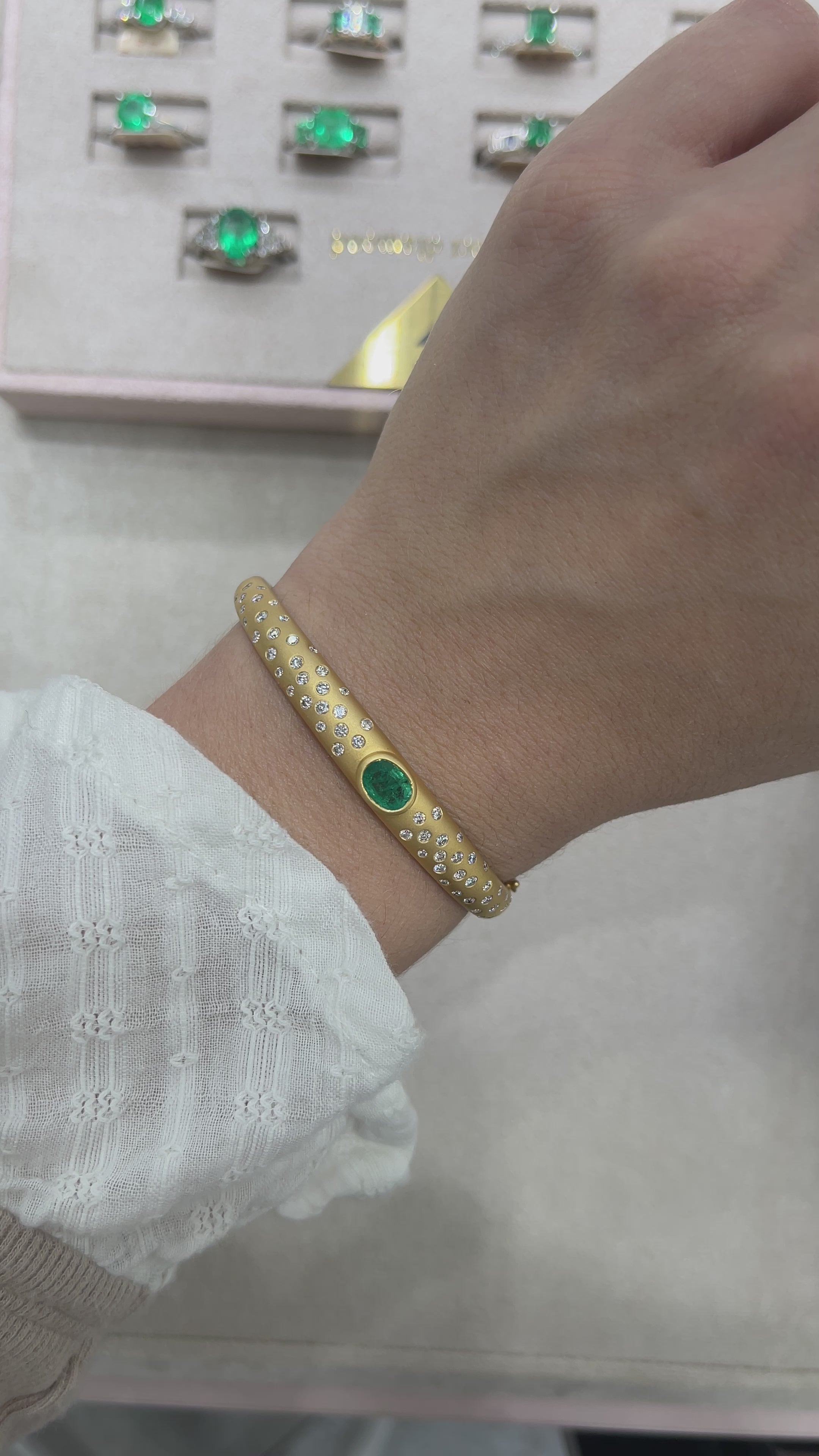 A mesmerizing bangle bracelet inspired by the beauty of the cosmos. At its heart, a luminous natural oval emerald is bezel-set in an east-to-west orientation, its medium-green hue shimmering with a depth that draws you in like the mysteries of the universe. Delicate round diamonds are scattered along the bracelet’s surface, each one flush-set to resemble twinkling stars in a celestial constellation. The gold is adorned with a handcrafted sandblast finish, diffusing the light like the soft glow of a distant galaxy. Designed to fit wrists from 5.75 to 6.25 inches, this ethereal piece glows with timeless beauty, whether worn alone or stacked among other treasures.